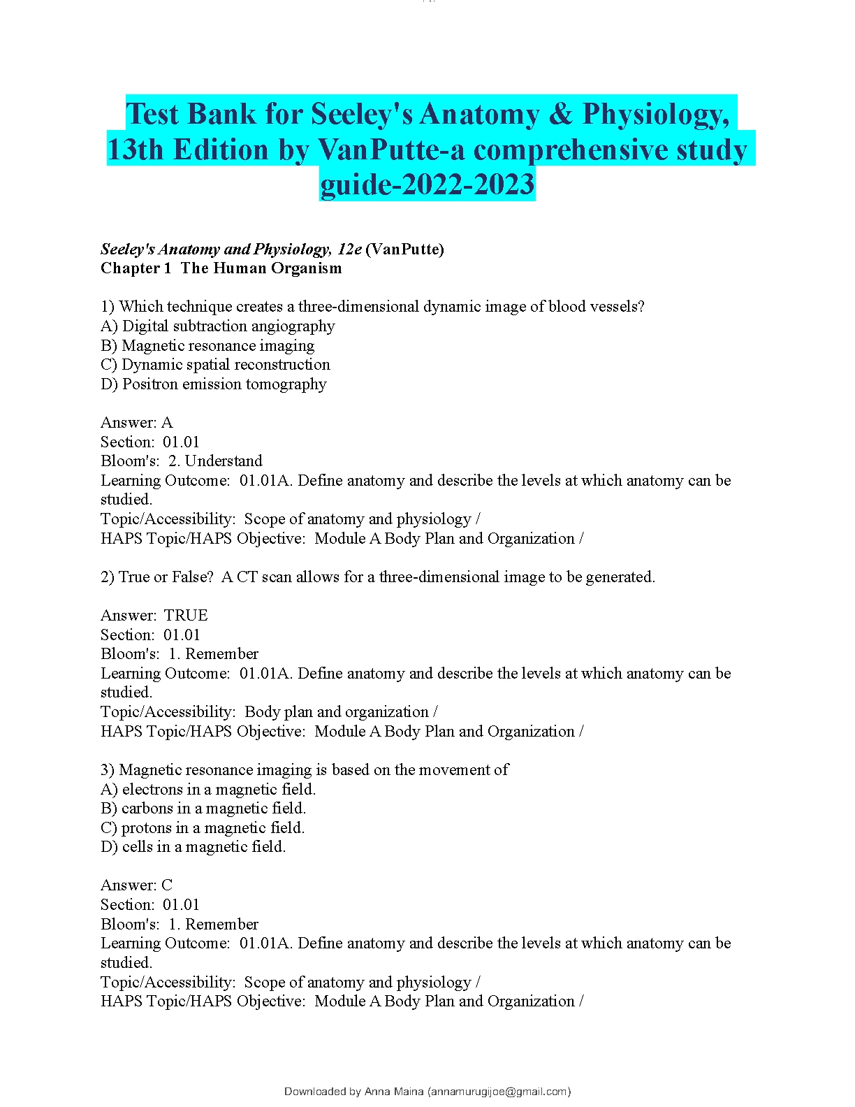 Test Bank for Seeley's Anatomy & Physiology, 13th Edition by VanPutte
