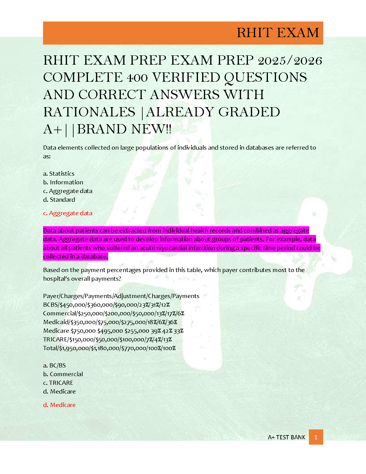 Ace your RHIT exam on the first attempt with this comprehensive prep resource for the 2025/2026 academic year. Featuring 400 verified questions and correct answers with detailed rationales, this guide is designed to help students master the material and avoid resits. Includes practice questions on data elements, patient record analysis, and healthcare payment structures.