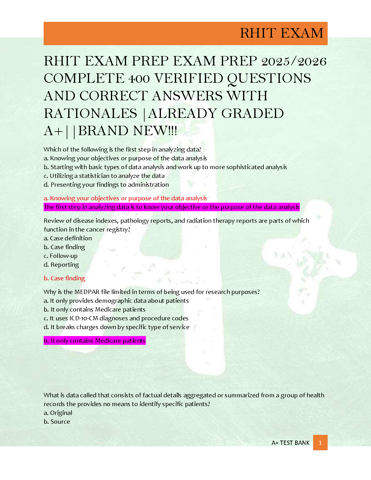 Ace your Registered Health Information Technician (RHIT) certification exam on your first attempt with this brand-new, comprehensive test bank for the 2025/2026 academic year. This essential resource features over 400 meticulously verified questions, each accompanied by detailed rationales and A+ graded answers, ensuring a deep understanding of core concepts. Designed to help you pass with confidence and avoid costly resits, this RHIT exam preparation material covers critical areas in health information management, data analysis, and medical coding. Prepare effectively and achieve your RHIT certification goals with this ultimate study companion.