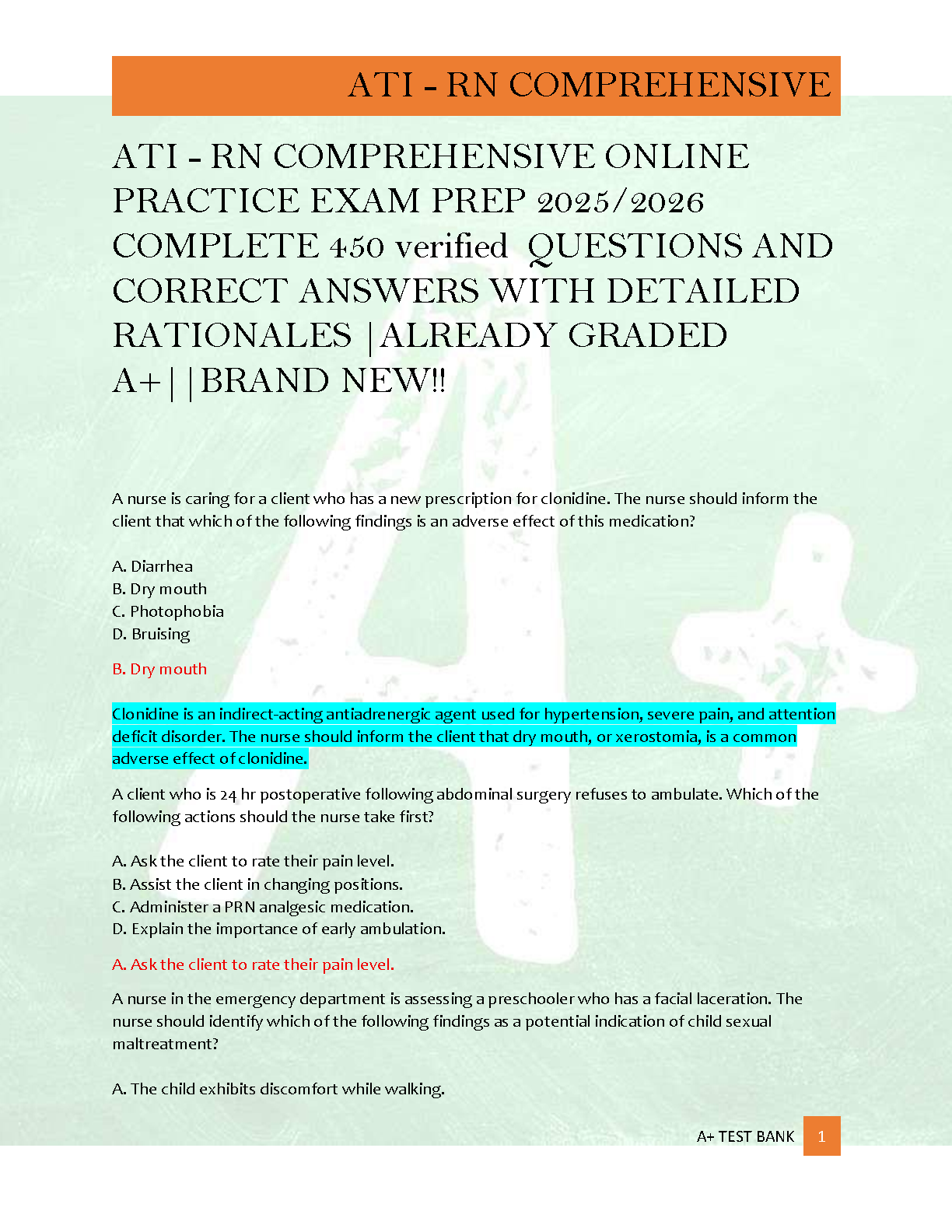 Ace your ATI RN Comprehensive exam on the first try! This comprehensive practice test bank features 450 verified questions, complete with detailed rationales and expert answers. Designed for the 2025/2026 academic year, this resource is your ultimate study companion to master the material and avoid resits. Includes brand new, graded content for optimal preparation.