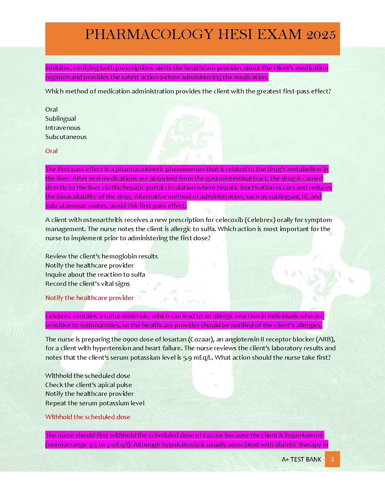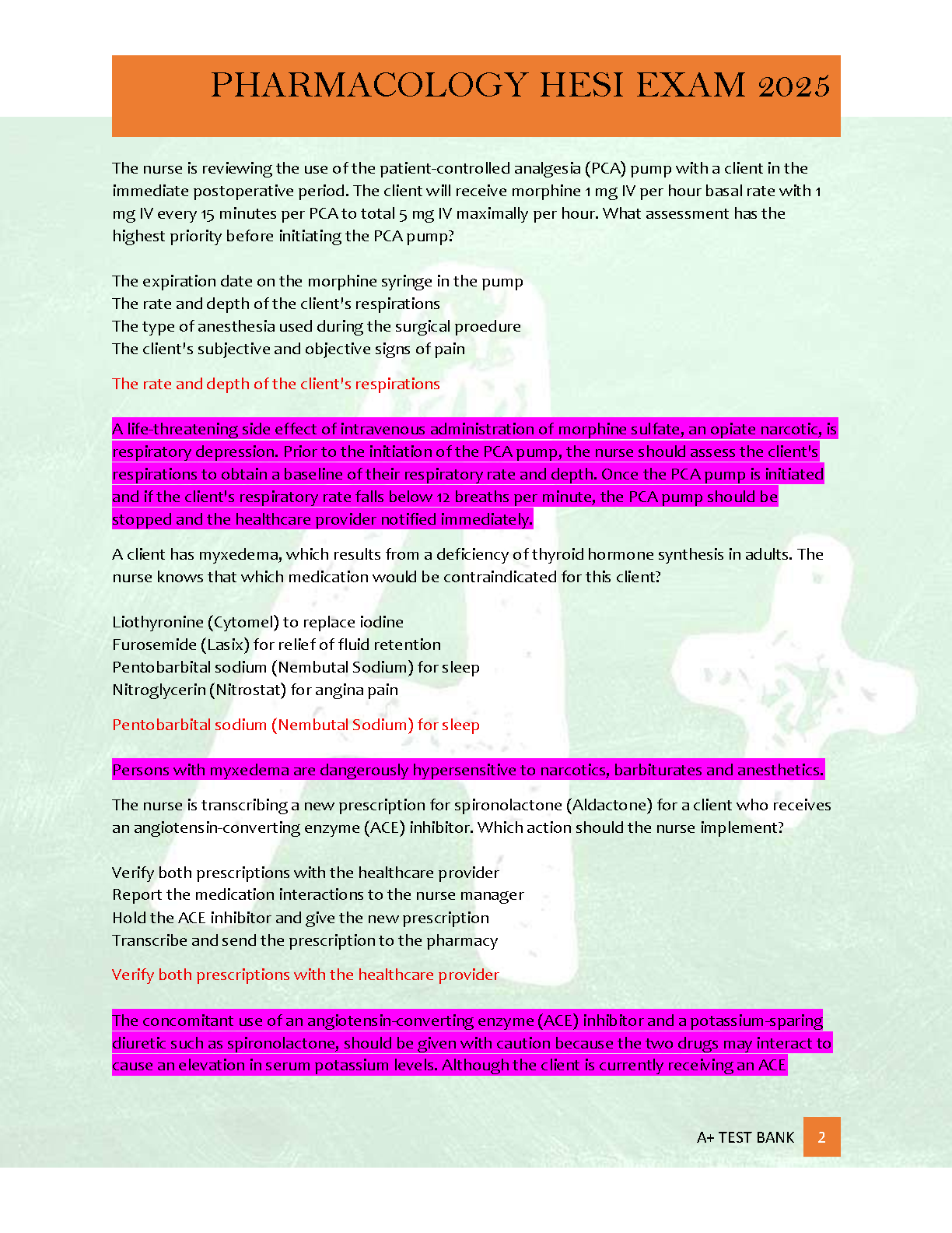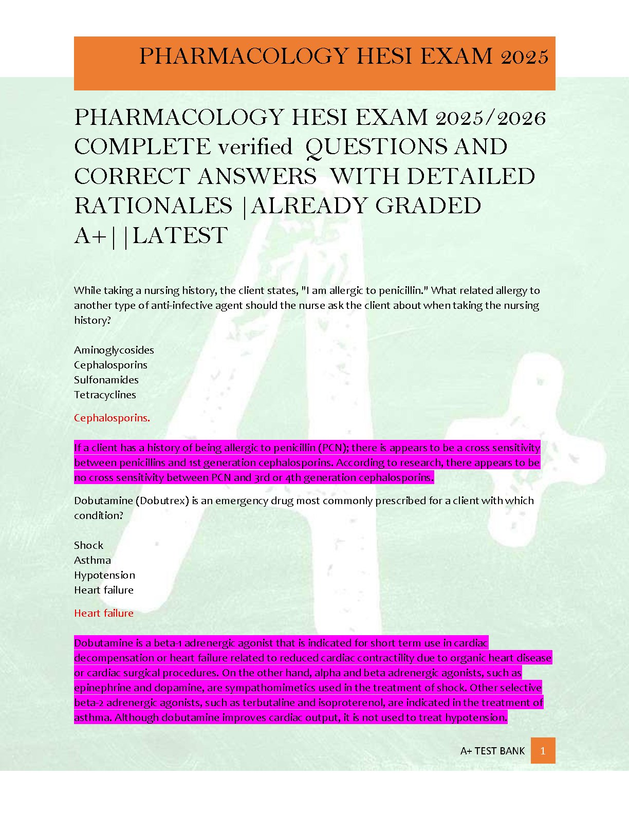 Master the Pharmacology HESI Exam for the 2025/2026 academic year with this comprehensive test bank. Featuring a meticulously compiled collection of verified questions, accurate answers, and in-depth rationales, this A+ graded resource is designed to equip nursing students with the knowledge and confidence needed for guaranteed first-attempt success. Stay ahead with the latest content and eliminate the worry of resits by thoroughly preparing with these exam-focused materials.