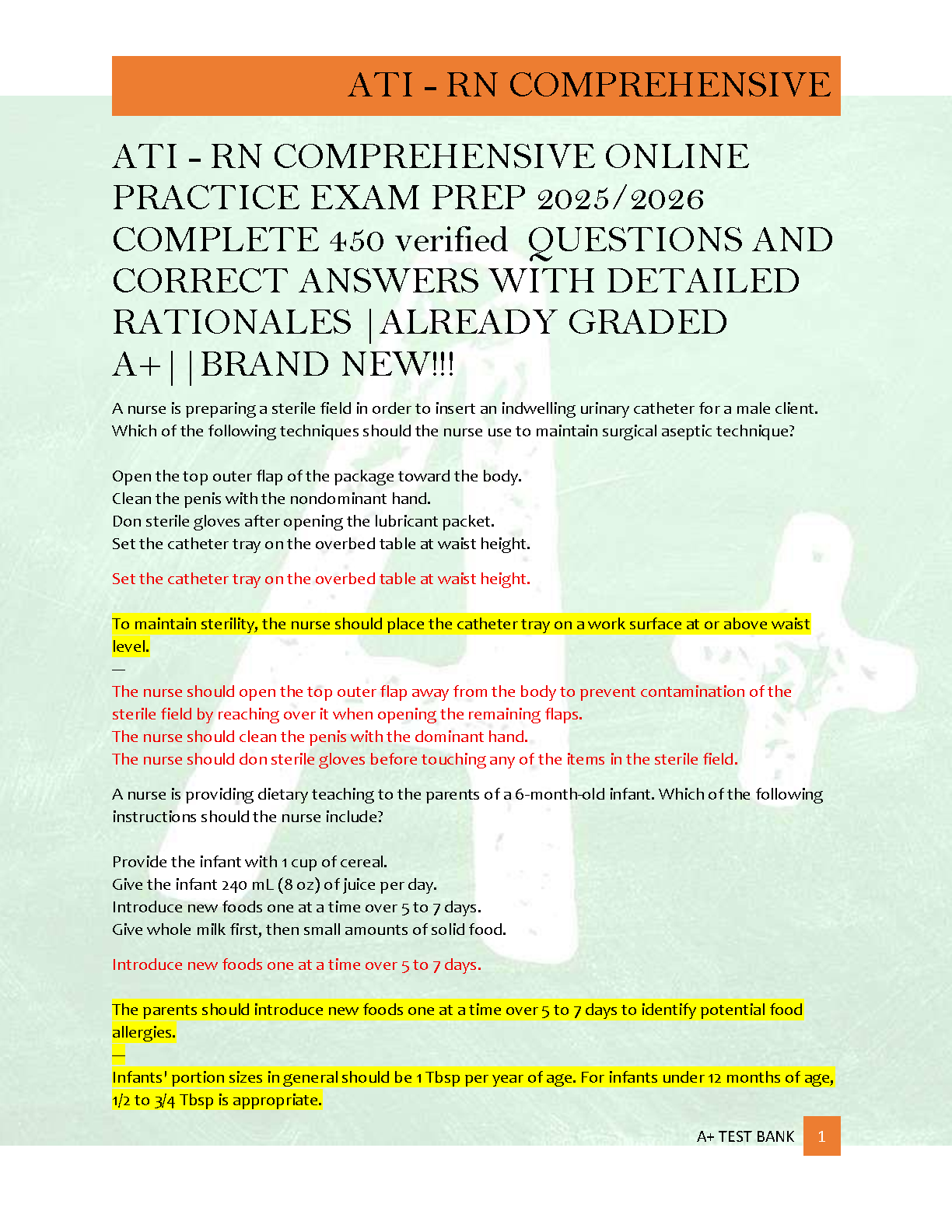 Elevate your readiness for the ATI RN Comprehensive Exam with this brand new, expertly compiled online practice exam prep for the 2025/2026 academic year. Featuring over 450 verified questions, complete with detailed rationales and A+-graded answers, this resource is specifically designed to help nursing students achieve guaranteed first-attempt success and confidently avoid costly resits. Master critical nursing concepts and refine your test-taking skills to pass your exams with confidence.