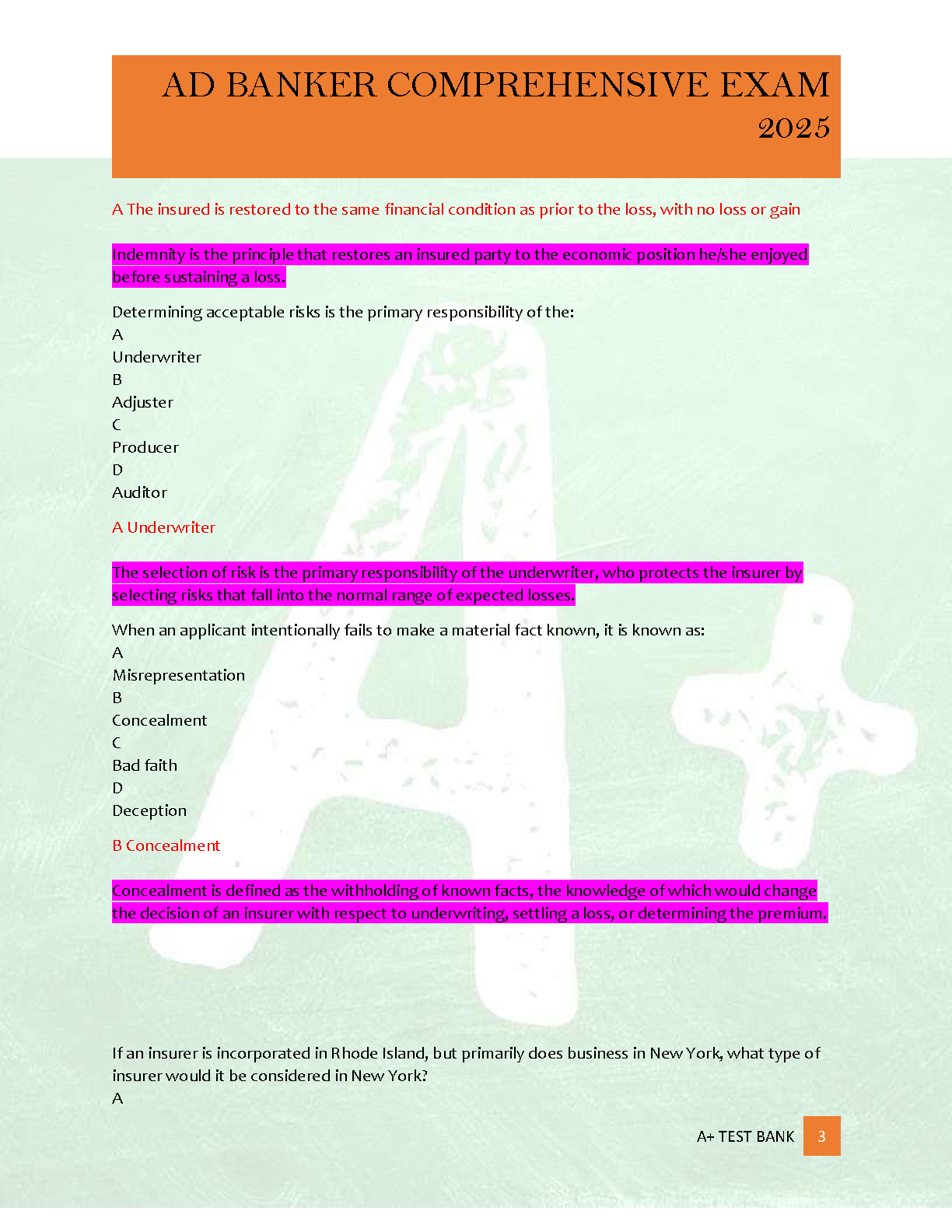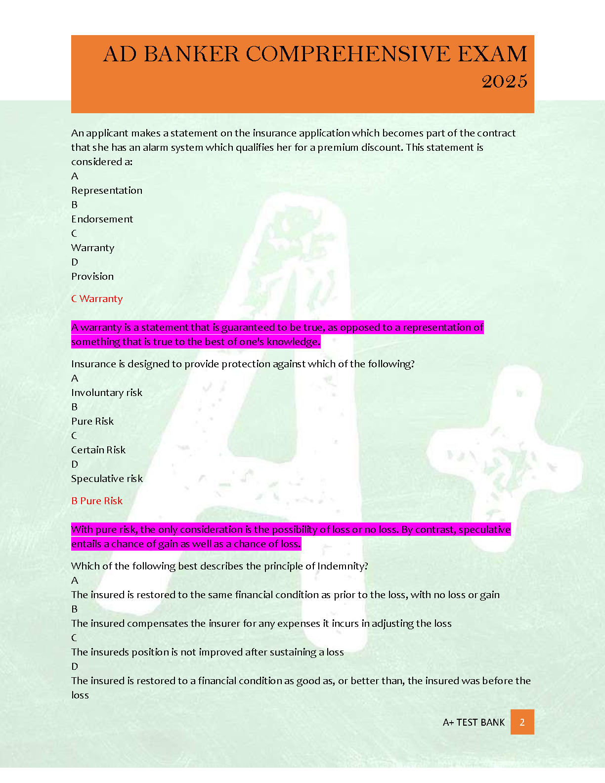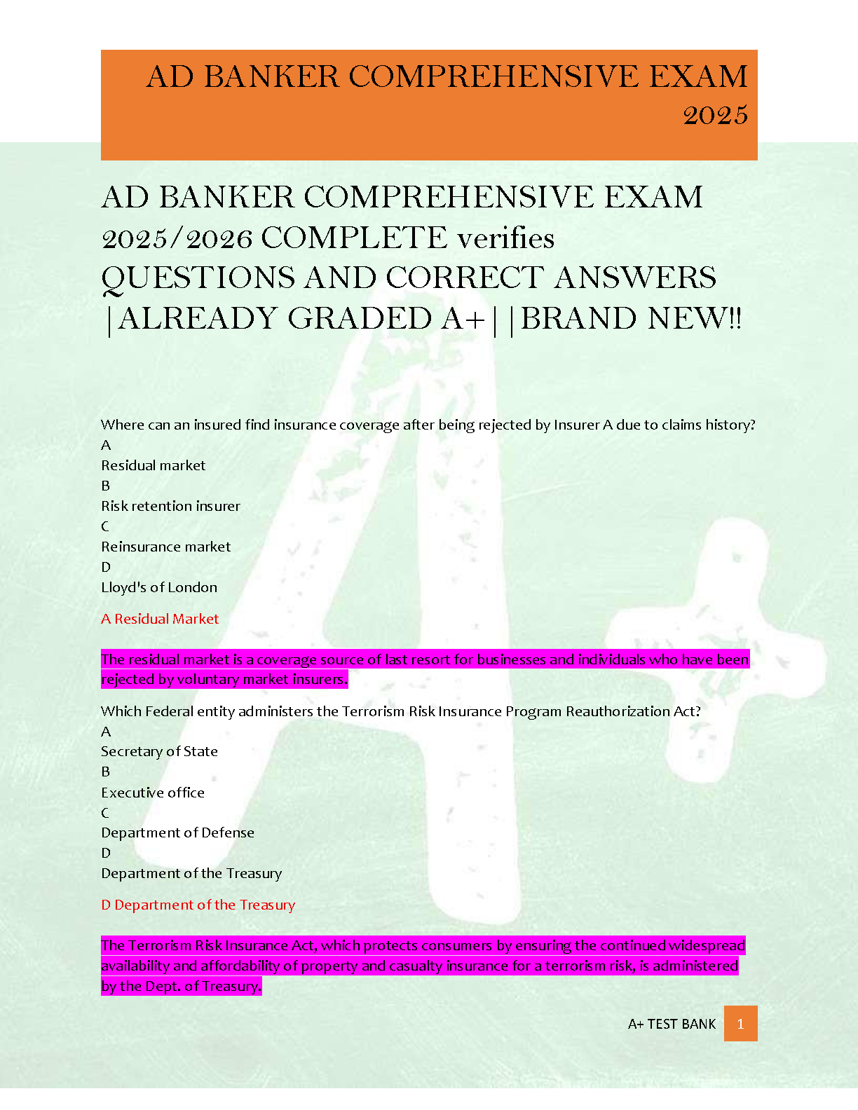 Unlock guaranteed success on your AD Banker Comprehensive Exam with this brand new, expertly curated Test Bank for the 2025/2026 academic year. Featuring complete, verified questions and A+ graded correct answers, this resource is meticulously designed to solidify your understanding and boost your confidence. Stop worrying about costly resits; prepare with the most current and relevant materials to pass your financial services and insurance certification exam on your very first attempt.