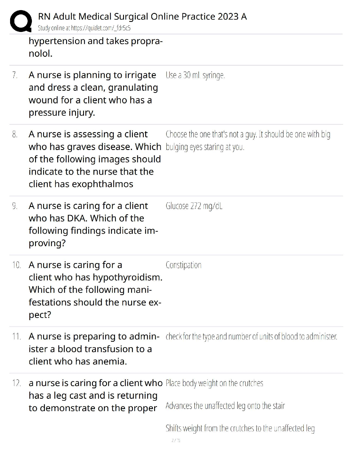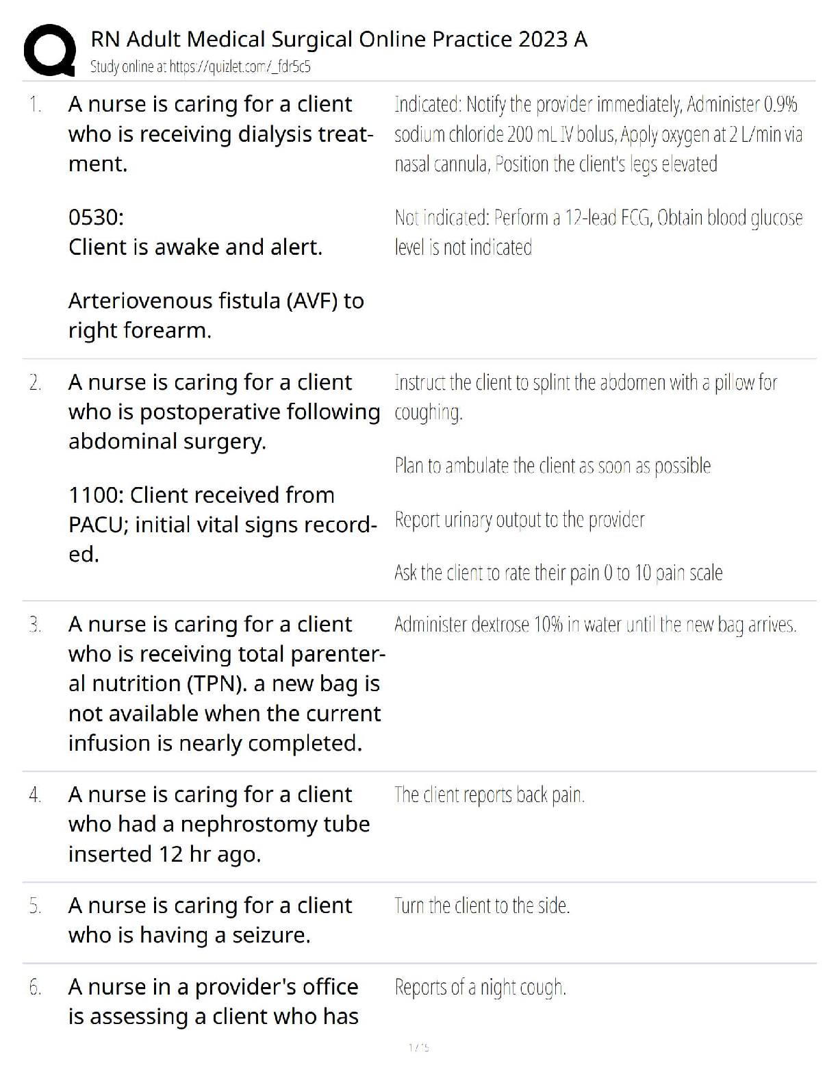 This comprehensive practice set, originally from 'RN Adult Medical Surgical Online Practice 2023 A' on Quizlet, provides essential questions for registered nurses and nursing students. Dive into detailed clinical scenarios covering critical adult medical-surgical topics, including dialysis, postoperative care, TPN, seizure management, and more. This invaluable test bank is meticulously designed to sharpen your clinical judgment and prepare you for the NCLEX, HESI, and other professional nursing exams. Utilize this up-to-date resource to master crucial nursing interventions, patient assessments, and care planning, significantly increasing your chances of passing on your first attempt for the 2023-2024 academic year.