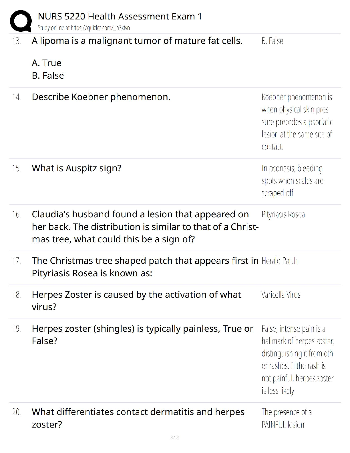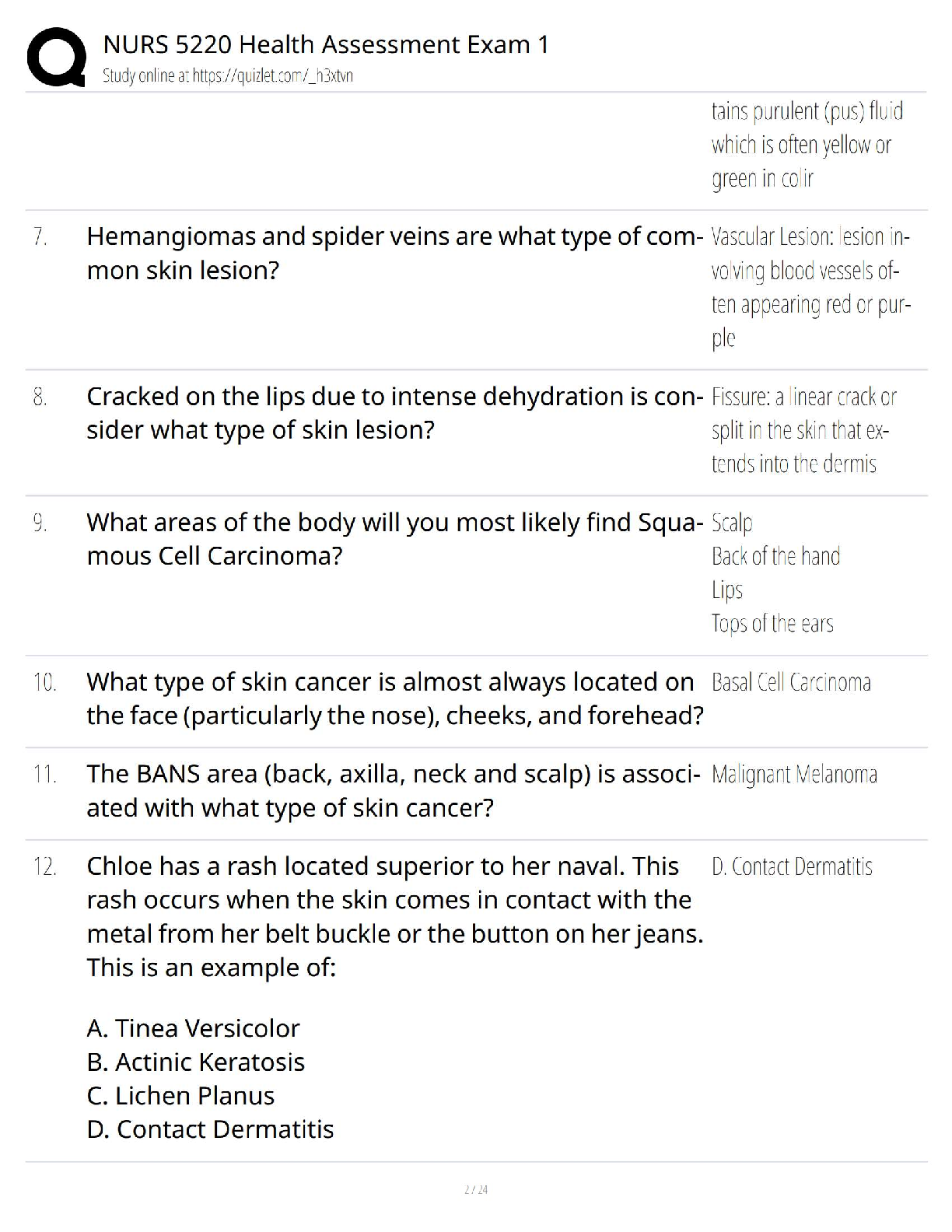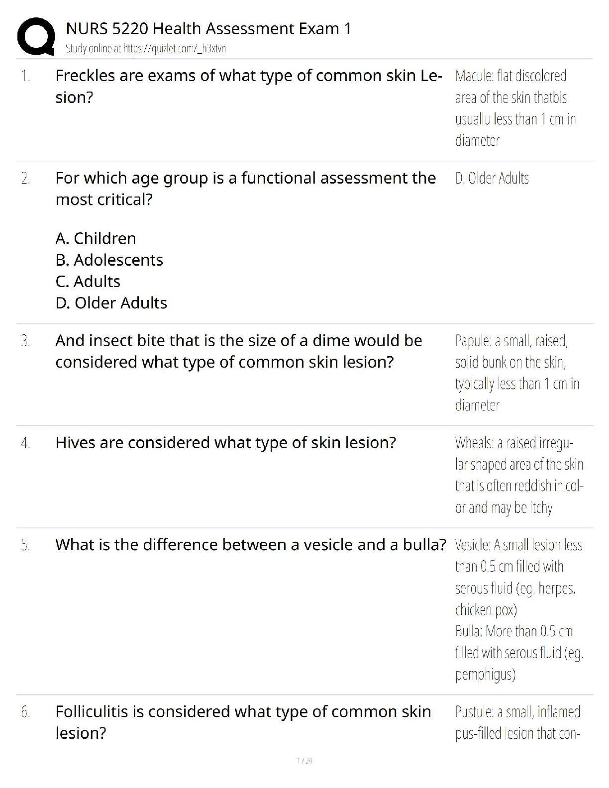 Ace your NURS 5220 Health Assessment Exam 1 with this invaluable 2025/2026 test bank, meticulously crafted to help you pass on your first attempt and eliminate the need for resits. Drawing from key concepts found in leading textbooks such as 'Health Assessment in Nursing' by Janet R. Weber and Jane H. Kelley (7th Edition), this resource provides targeted practice questions and clear answers. Elevate your mastery of crucial health assessment topics, including the precise identification of common skin lesions (macules, papules, wheals, vesicles, bullae, pustules) and essential principles of functional assessment across different age groups. This comprehensive study aid is your ultimate preparation tool for a confident and successful nursing academic year.