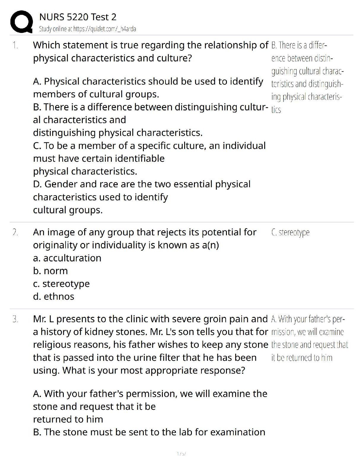 Ace your NURS 5220 exams on the first attempt with this comprehensive test bank! This resource covers essential concepts in cultural competence, including the relationship between physical characteristics and culture, understanding stereotypes, and appropriate patient care responses in sensitive situations. Designed for the 2025/2026 academic year, these practice questions will equip you with the knowledge to confidently pass your exams and avoid resits.