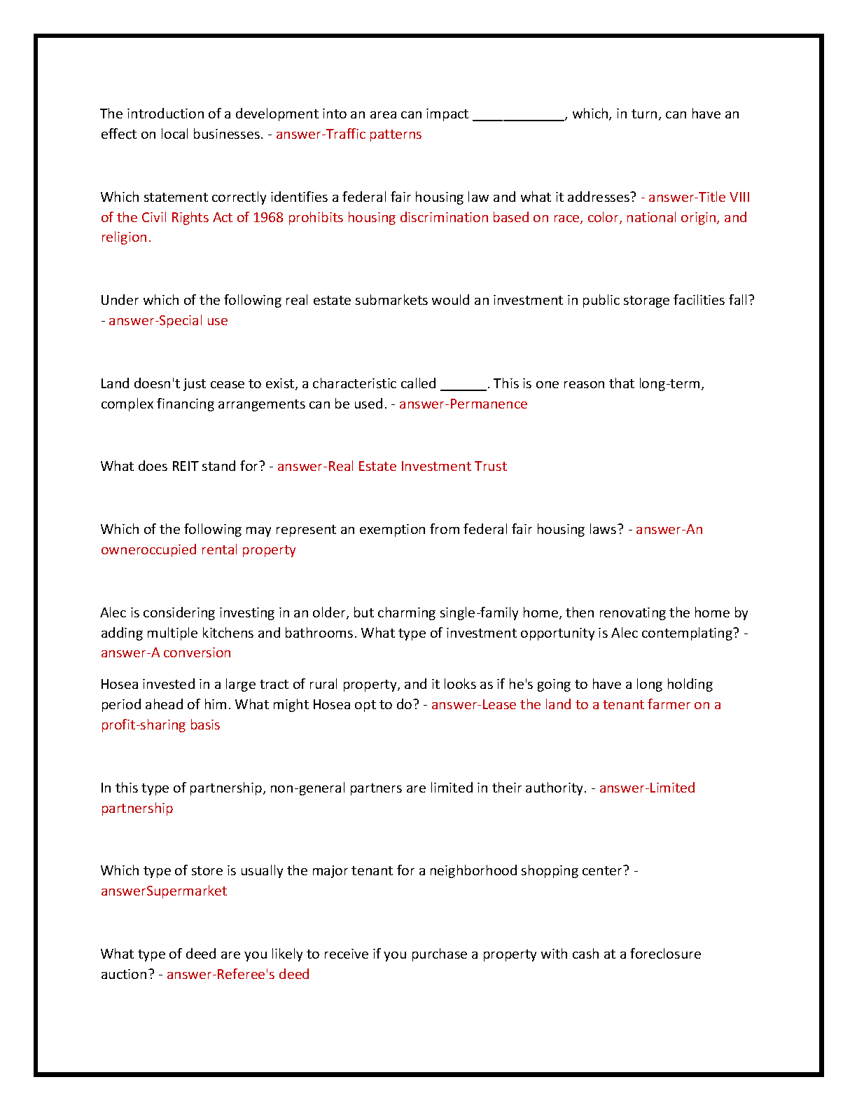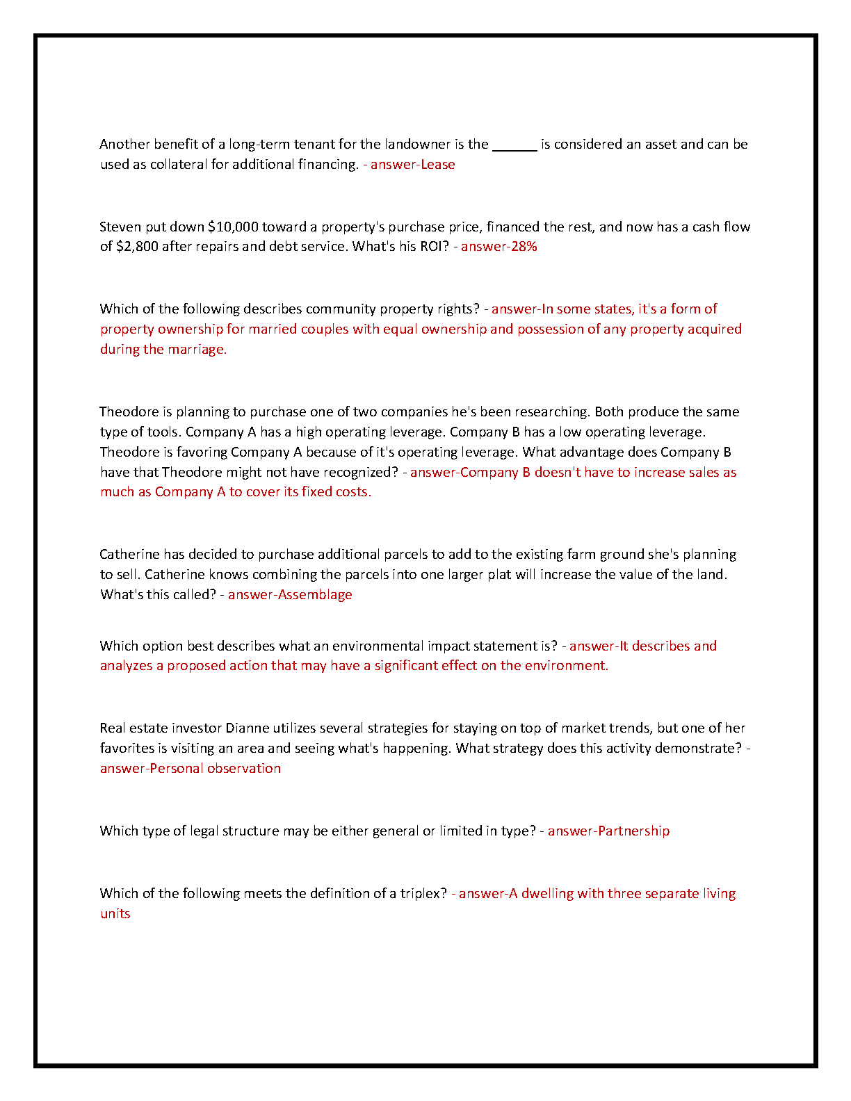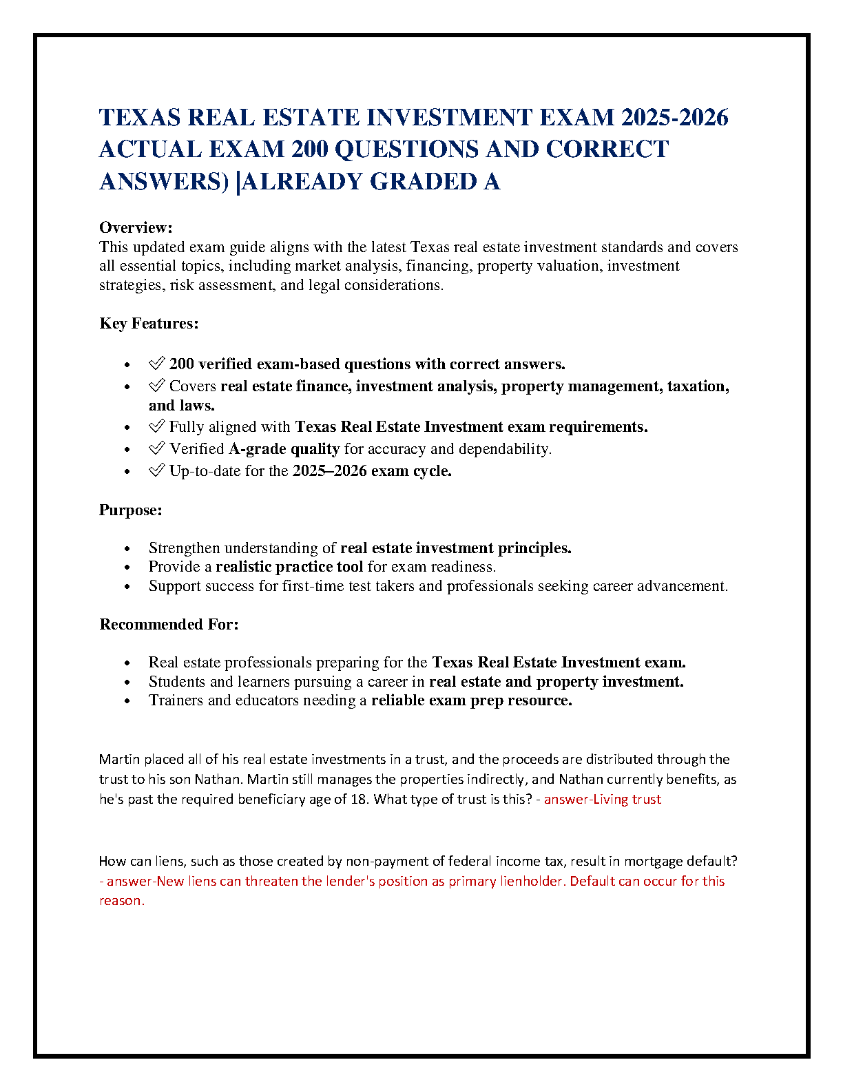 Conquer the Texas Real Estate Investment Exam 2025-2026 with this comprehensive test bank featuring 200 verified, exam-based questions and thoroughly explained correct answers. This essential resource is meticulously updated for the latest exam cycle, covering critical topics such as real estate finance, investment analysis, property management, taxation, and legal frameworks. Designed for aspiring real estate professionals, students, and educators, it provides realistic practice and A-grade quality content to ensure you pass your certification on the very first attempt and avoid costly resits. Master key principles, boost your confidence, and achieve career advancement with this reliable exam prep tool.