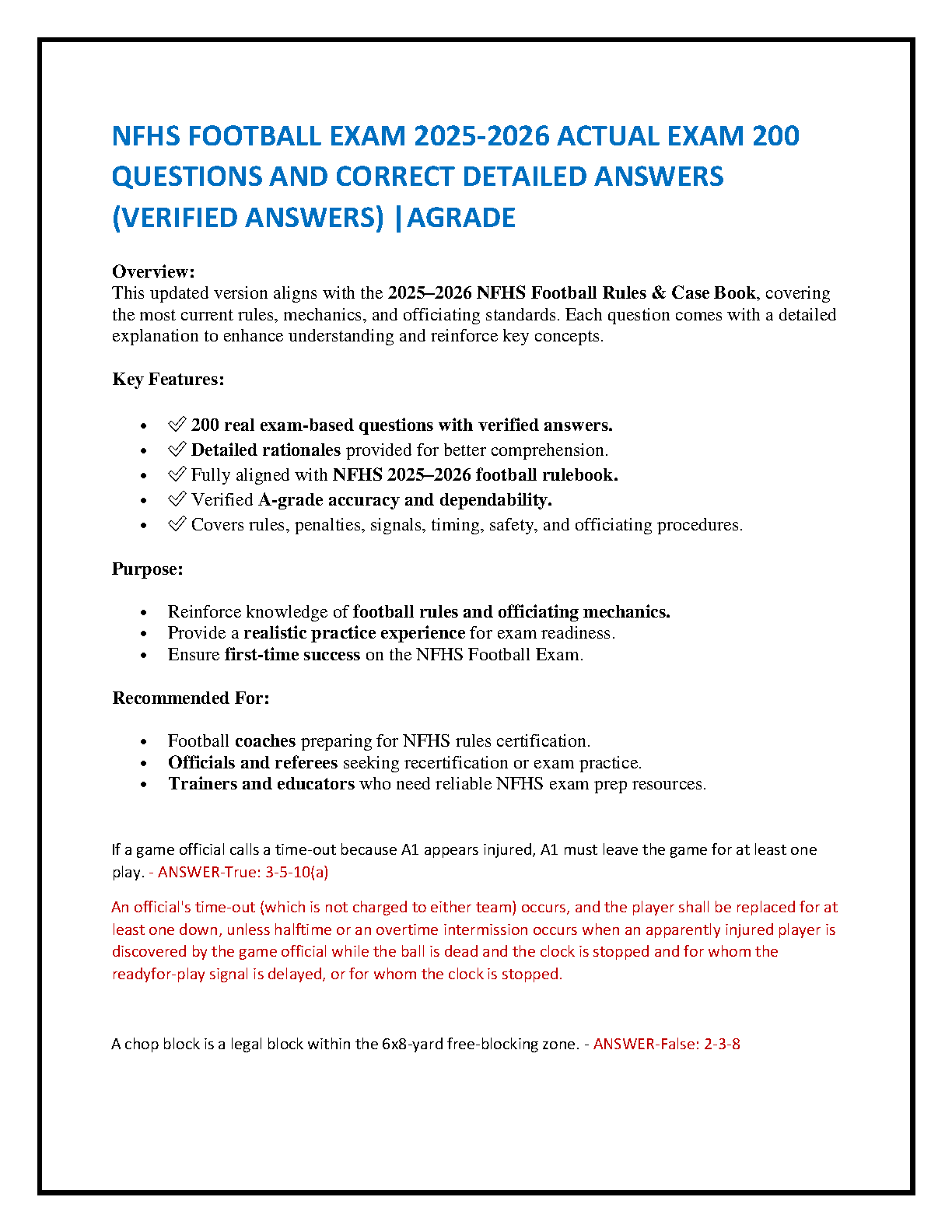 NFHS Football Rules Exam Prep 2025-2026: Official Test Bank by National Federation of State High School Associations (NFHS) – 200+ Verified Questions & Detailed Answers for First-Time Pass