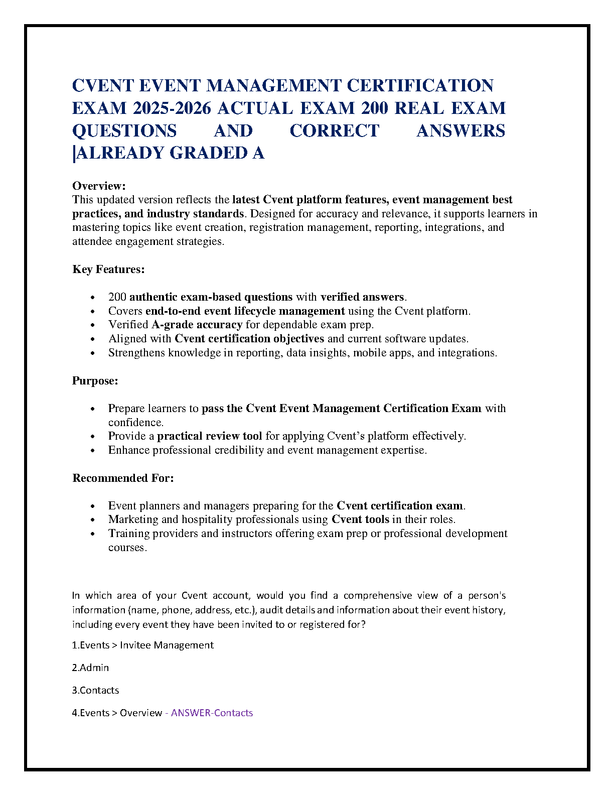 Master the Cvent Event Management Certification Exam with this comprehensive resource, featuring 200 authentic, exam-based questions and verified answers. Updated for the 2025-2026 academic year, this guide covers the full event lifecycle and Cvent platform functionalities, ensuring you gain the knowledge and confidence to pass on your first attempt and avoid resits. Perfect for event planners, managers, and marketing professionals seeking to enhance their expertise and professional credibility.