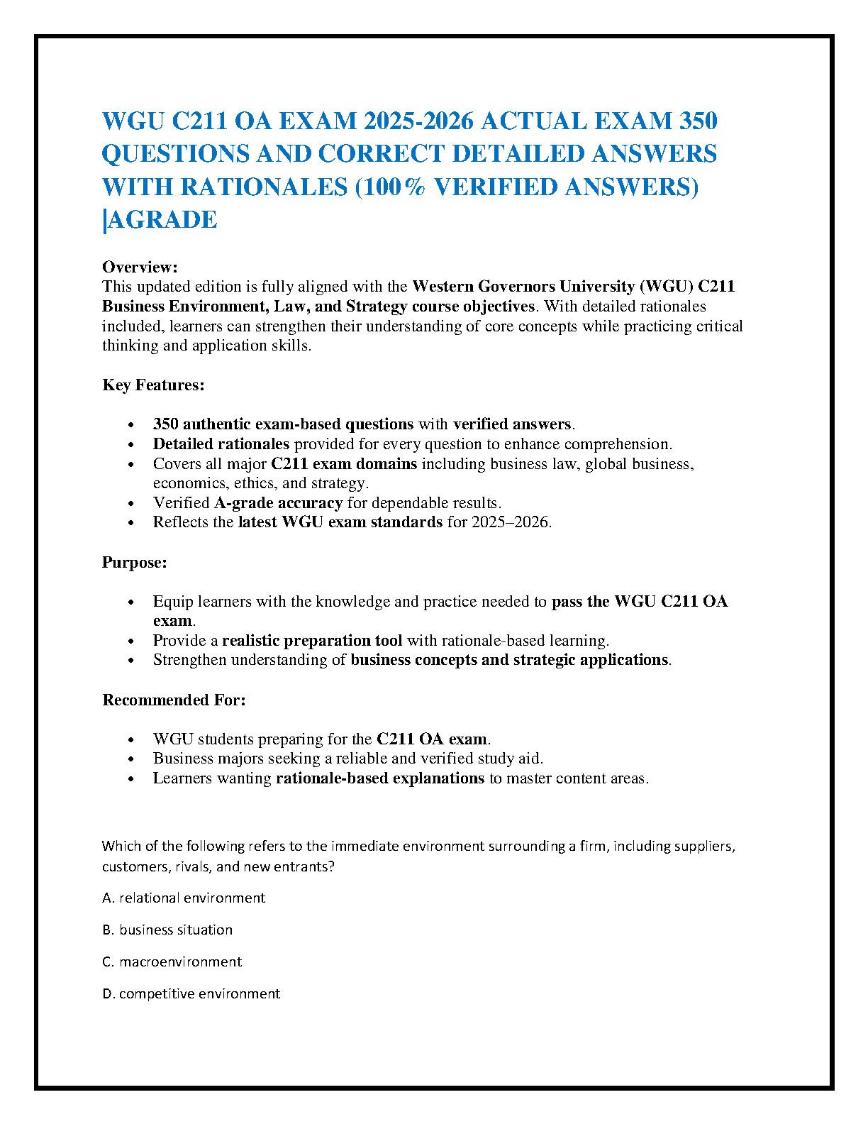 Master the WGU C211 OA exam on your first try with this comprehensive study guide. Featuring 350 authentic, exam-based questions with detailed, verified rationales, this resource covers all key domains of the Business Environment, Law, and Strategy course. Perfect for WGU students and business majors aiming for A-grade accuracy and a deeper understanding of core concepts. Prepare effectively for the 2025-2026 academic year and avoid resits.