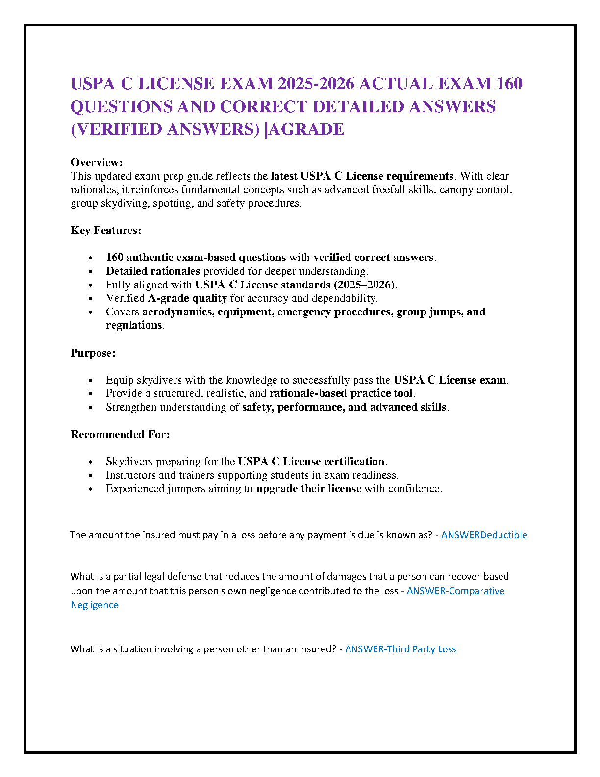 USPA C License Exam 2025-2026: 160 Authentic Questions & Detailed Answers by AGRade