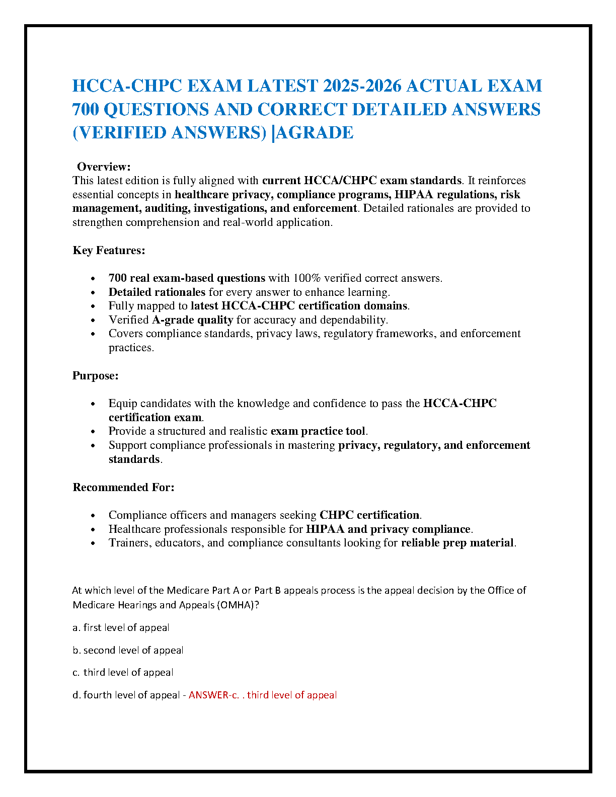 Prepare comprehensively for the HCCA-CHPC Certification Exam 2025-2026 with this premium test bank. Featuring over 700 meticulously verified, real exam-based questions, each accompanied by detailed A-grade rationales, this resource is designed to ensure you pass on your first attempt and avoid resits. Fully aligned with the latest HCCA-CHPC certification domains, it covers critical areas such as healthcare privacy, HIPAA regulations, compliance programs, risk management, auditing, investigations, and enforcement. Ideal for compliance officers, healthcare professionals, and anyone aiming for top performance in CHPC certification, this practice tool boosts confidence, deepens understanding, and provides the essential knowledge to excel in real-world application.