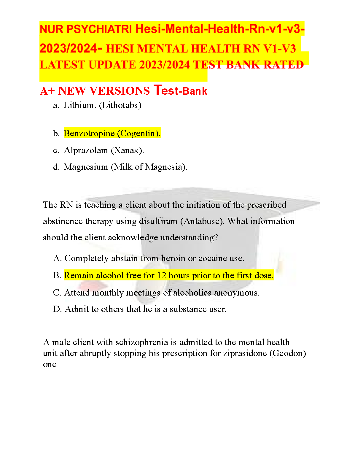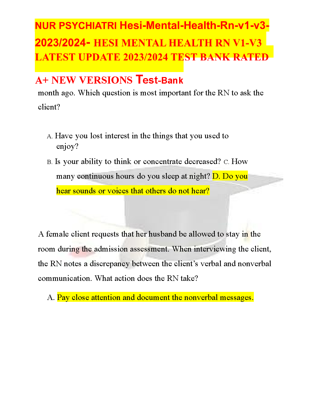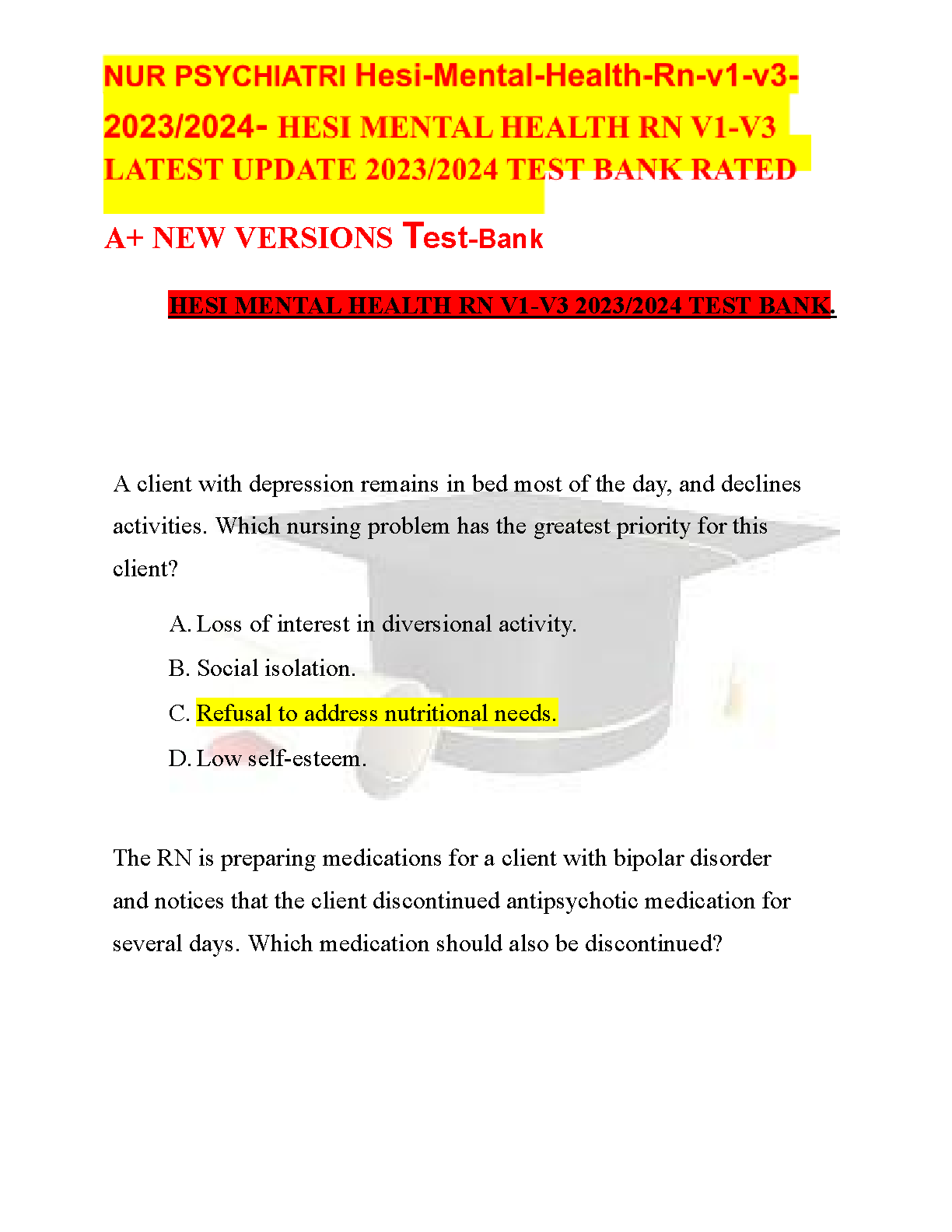 Unlock success in your psychiatric nursing studies with the latest 2023/2024 HESI Mental Health RN Test Bank, encompassing Versions 1-3. This premium resource, developed by HESI/Elsevier, provides up-to-date, A-rated questions and detailed rationales covering critical topics like client priority setting in depression and medication management for bipolar disorder. Specifically designed to equip you with the knowledge and critical thinking skills needed to ace your HESI exam, this test bank helps you avoid costly resits and confidently embark on your nursing career. Prepare smarter, understand key concepts thoroughly, and ensure you pass your exams on the very first try.