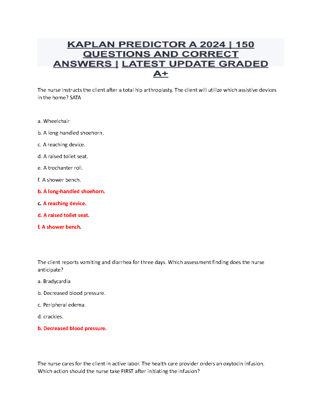Master your Kaplan Predictor A 2024 exam with this expertly curated test bank. Featuring 150 up-to-date questions and thoroughly verified correct answers from Kaplan Test Prep, this resource is designed to help nursing students build confidence and ace their assessment. Get comprehensive practice and ensure you're fully prepared for success on your first attempt with this A+ graded study material, mirroring the latest content for your 2024 Kaplan Predictor A.