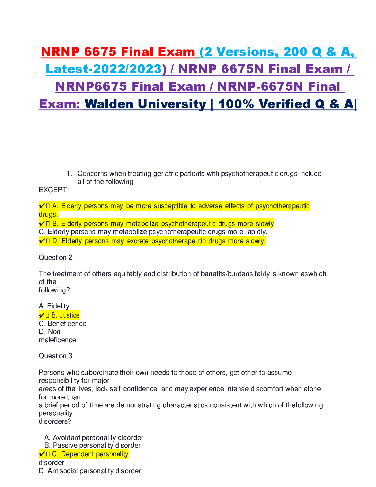NRNP 6675 Final Exam: Walden University - 2 Versions, 200 Q&A (Latest 2022/2023)