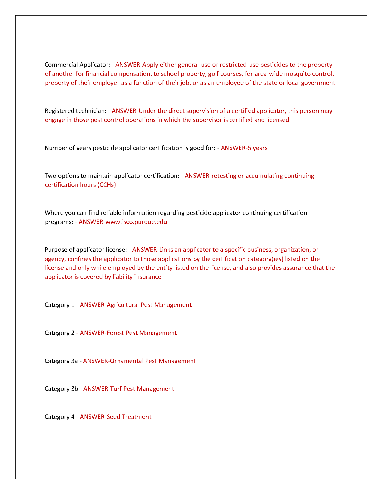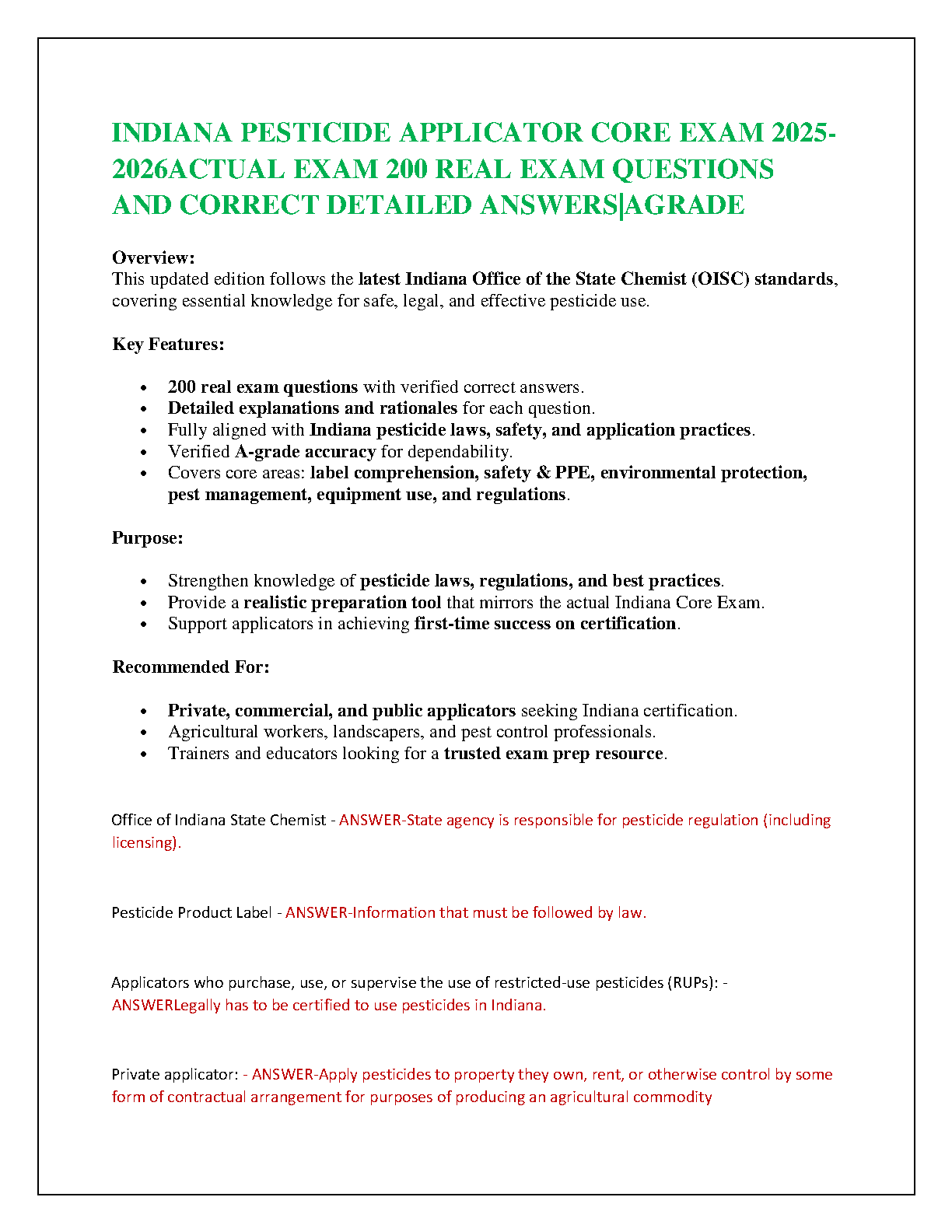 Prepare confidently for the Indiana Pesticide Applicator Core Exam 2025-2026 with this comprehensive test bank. Designed to align with the latest Indiana Office of the State Chemist (OISC) standards, this resource offers 200 realistic practice questions, each accompanied by verified correct answers, detailed explanations, and rationales. Covering critical areas such as label comprehension, safety protocols, environmental protection, pest management, equipment operation, and state regulations, it's an indispensable tool for mastering Indiana pesticide laws and best practices. Achieve first-attempt success and avoid costly resits, ensuring you're fully prepared for your certification.
