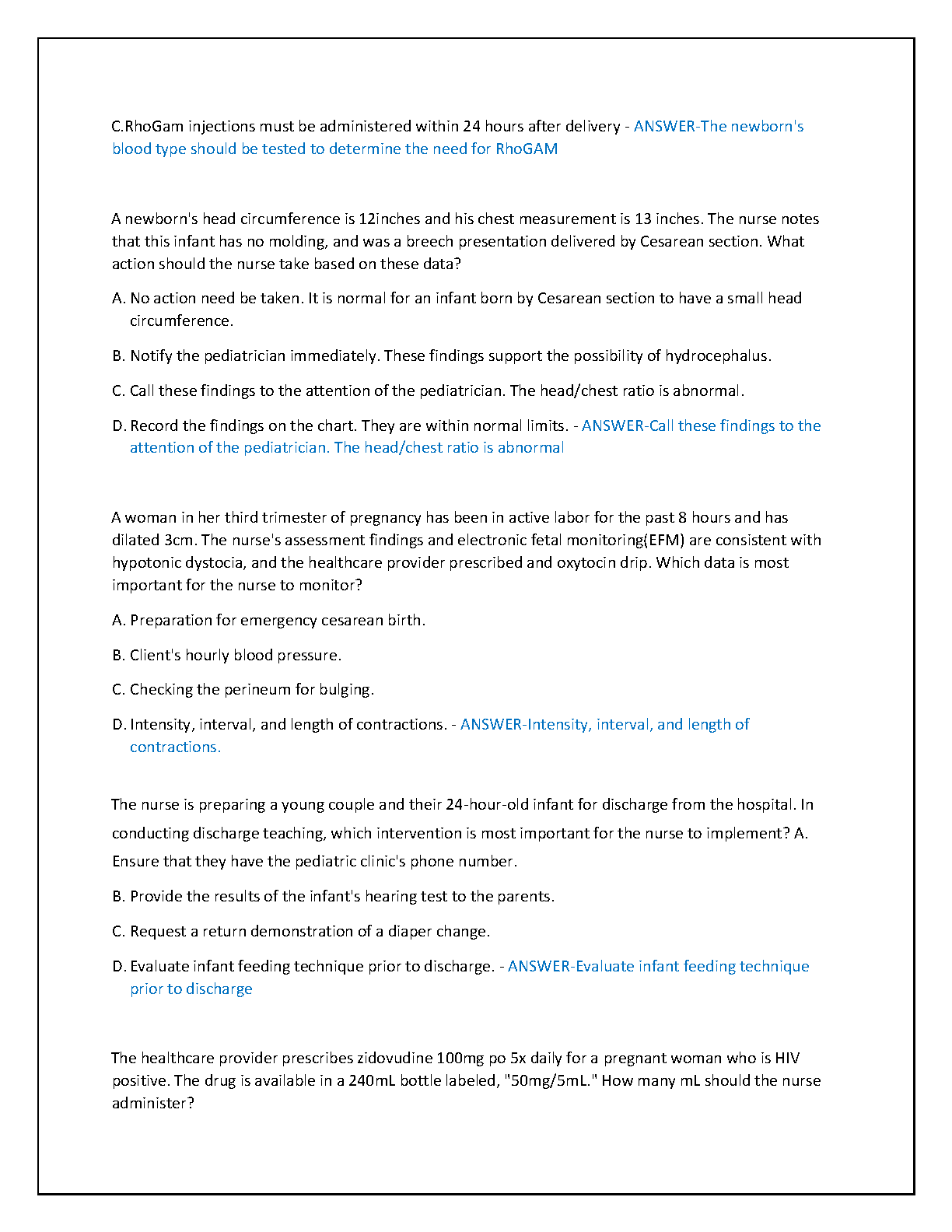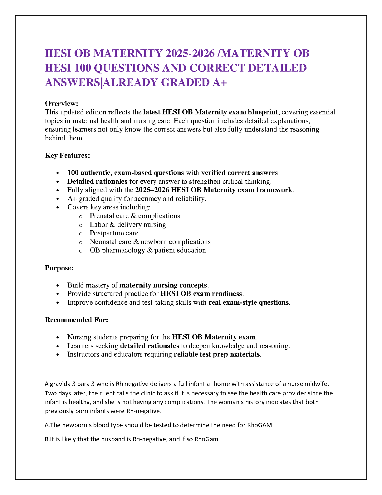 Unlock your full potential for the HESI OB Maternity exam with this comprehensive, A+ graded study resource meticulously updated for the 2025-2026 academic year. Developed by HESI / Elsevier, this unique test bank provides 100 authentic, exam-style questions fully aligned with the latest HESI OB Maternity blueprint and framework. Each question is accompanied by detailed rationales and verified correct answers, ensuring deep understanding rather than mere memorization. Master critical areas including prenatal care, labor and delivery nursing, postpartum care, neonatal complications, and OB pharmacology. Designed to build concept mastery, significantly boost exam confidence, and sharpen test-taking skills, this essential guide is your ultimate tool to pass the HESI OB Maternity exam on your first attempt and confidently avoid costly resits. Ideal for nursing students, educators, and anyone aspiring to achieve top scores in maternal health nursing.