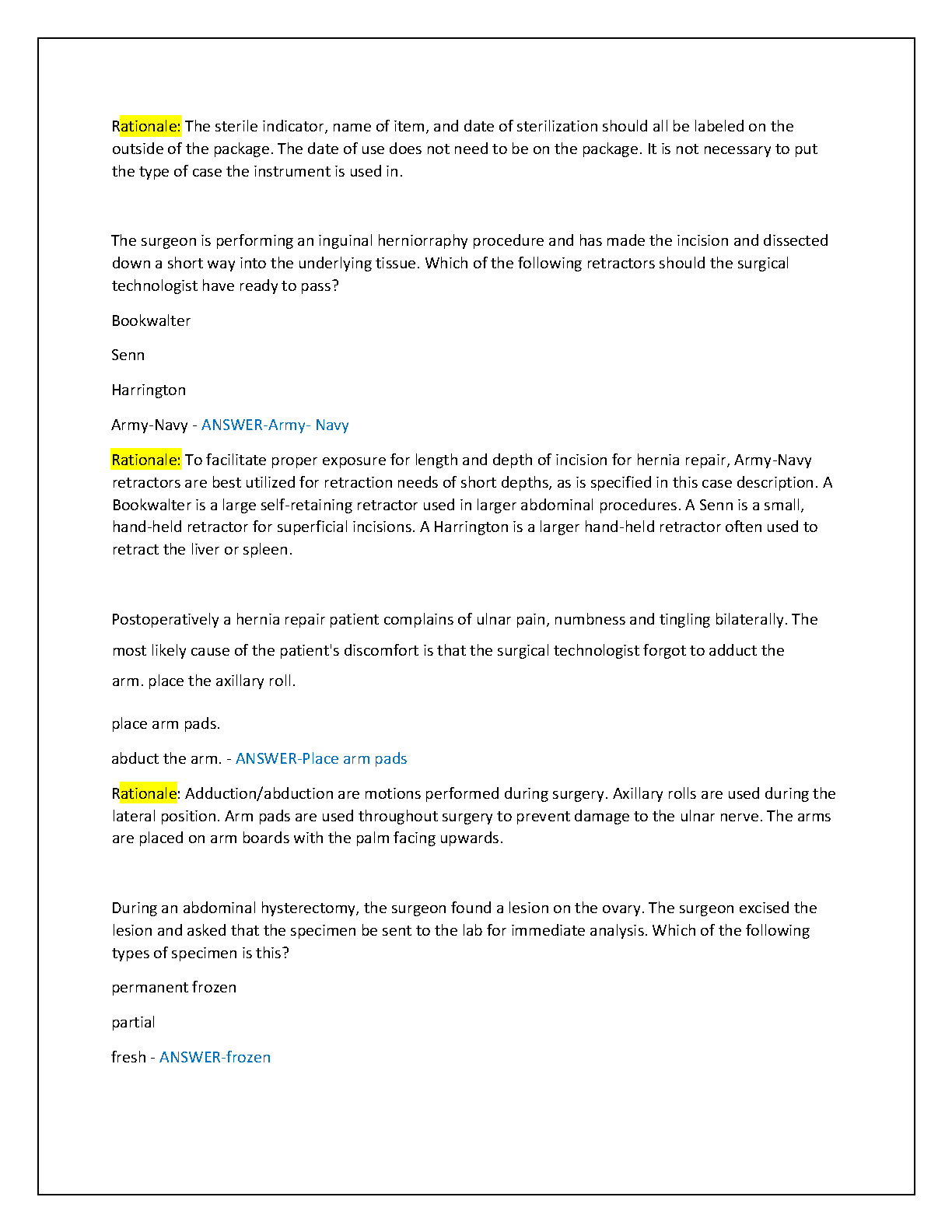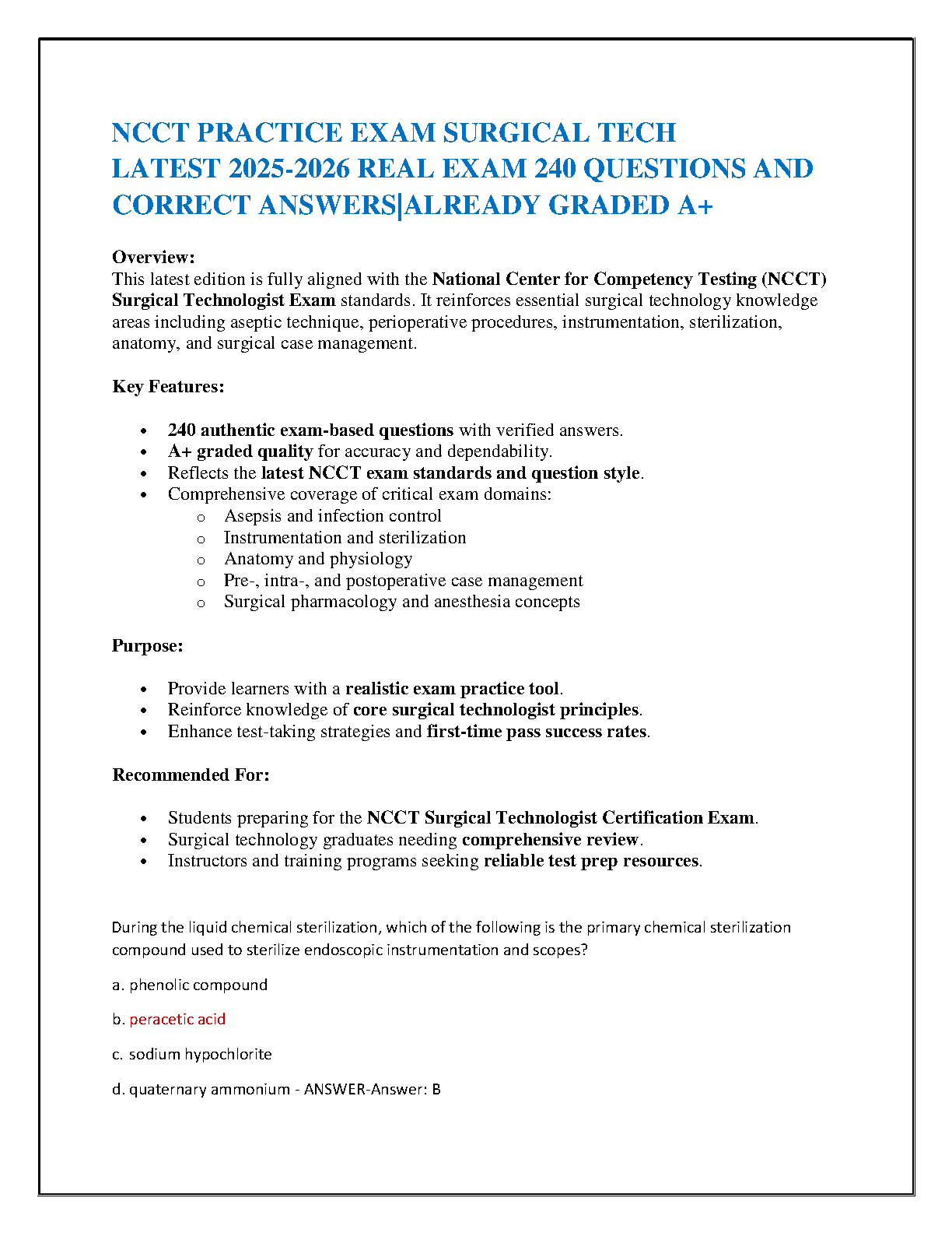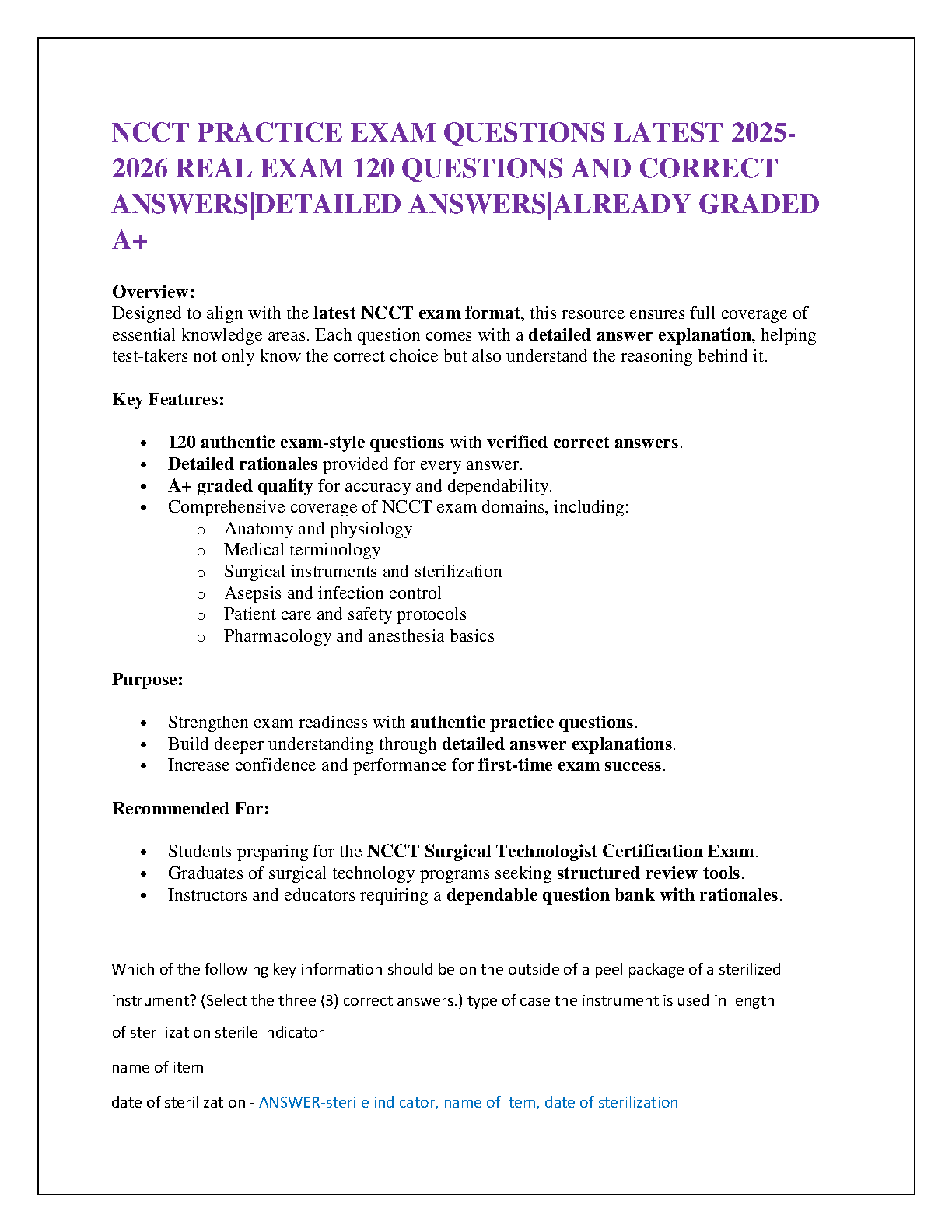 Ace your NCCT Surgical Technologist Certification Exam on your first attempt with this comprehensive practice question bank for the 2025-2026 academic year. Featuring 120 authentic, exam-style questions aligned with the latest NCCT format, this invaluable resource provides verified correct answers, detailed rationales, and an A+ graded quality to ensure deep understanding. Covering all essential domains including Anatomy & Physiology, Medical Terminology, Surgical Instruments & Sterilization, Asepsis & Infection Control, Patient Care & Safety Protocols, and Pharmacology & Anesthesia Basics, this tool is designed to boost your confidence and readiness, helping you avoid costly resits. Ideal for students, graduates of surgical technology programs, and instructors seeking a dependable question bank for optimal exam preparation.