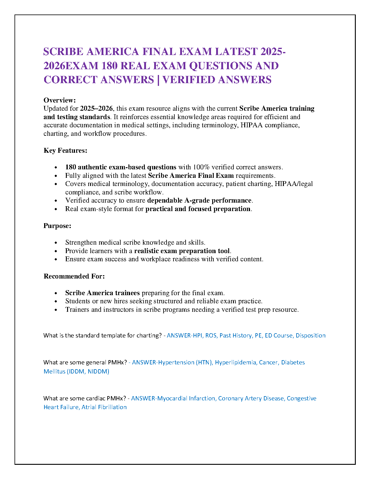 Prepare for success on your Scribe America Final Exam with this meticulously updated test bank for the 2025-2026 academic year. Featuring 180 authentic, exam-style questions paired with 100% verified correct answers, this resource is engineered to help you achieve an A-grade and pass on your initial attempt, eliminating the need for resits. It offers comprehensive coverage of critical areas including medical terminology, accurate documentation, patient charting, HIPAA compliance, and efficient scribe workflow. Ideal for Scribe America trainees, new medical scribe hires seeking structured practice, and instructors needing a reliable test preparation tool, this resource strengthens knowledge, hones essential skills, and ensures you're workplace-ready with its practical, focused format.