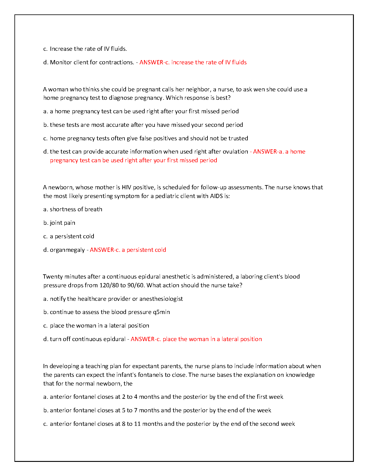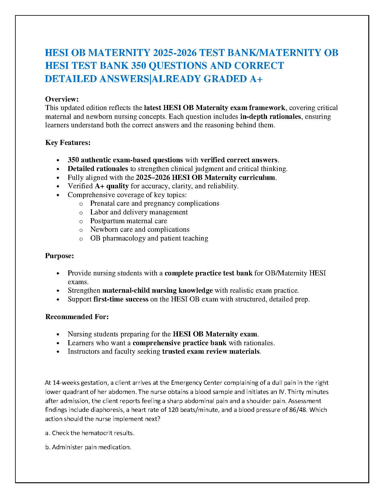 Master your HESI OB Maternity exam with this comprehensive 2025-2026 edition test bank, featuring 350 authentic, exam-based questions and detailed rationales. Developed by Elsevier HESI experts, this resource is fully aligned with the latest curriculum, providing A+ quality content for accuracy and reliability. Covering essential topics like prenatal care, labor & delivery, postpartum care, newborn nursing, and OB pharmacology, it's designed to strengthen your clinical judgment and critical thinking. Achieve first-attempt success on your HESI OB exam and avoid costly resits with this structured, detailed practice. Ideal for nursing students seeking thorough preparation and confident exam performance.