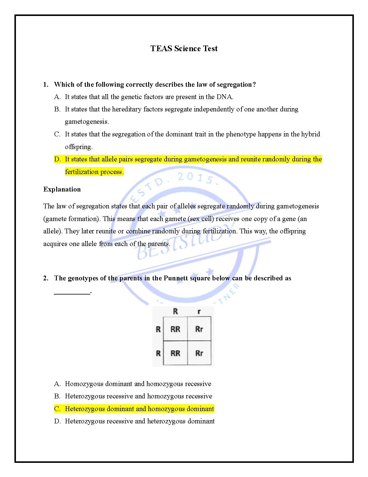 Prepare comprehensively for the ATI TEAS Science exam with this targeted practice test bank. Featuring multiple-choice questions on essential biology topics like Mendel's Law of Segregation and Punnett Square genetics, each question includes a clear explanation to reinforce understanding. Originally derived from a 2015 study resource, this material is designed to help students master fundamental scientific concepts, boost their confidence, and ensure they pass their TEAS Science section on the first attempt, avoiding costly resits. Ideal for reviewing key biological principles and test-taking strategies.