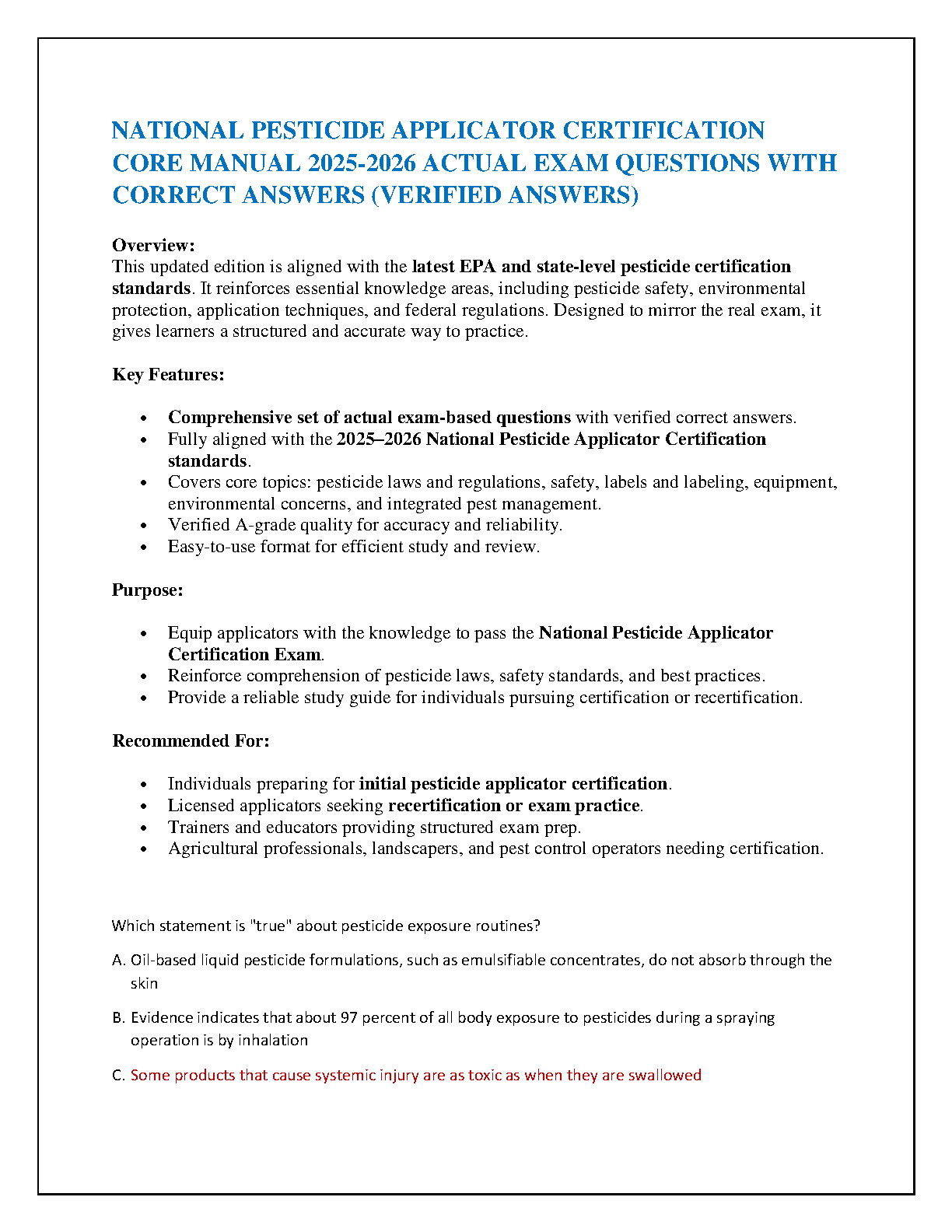 National Pesticide Applicator Certification Core Manual 2025-2026: Verified Exam Questions & Answers for First-Time Pass