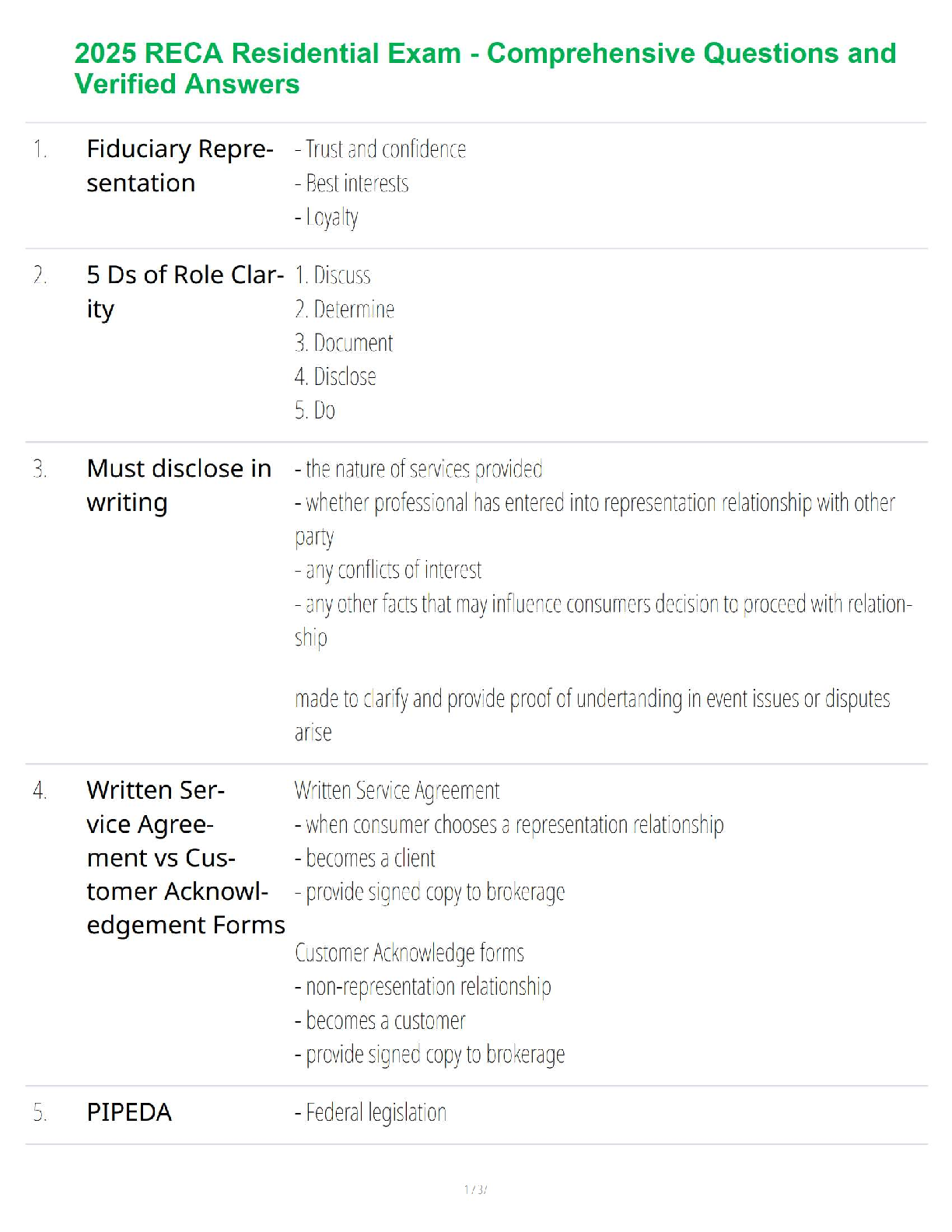 Master the 2025 RECA Residential Exam with this comprehensive study resource. Featuring detailed questions and verified answers covering fiduciary representation, disclosure requirements, service agreements, and PIPEDA. Prepare for success and avoid resits with expertly crafted content.