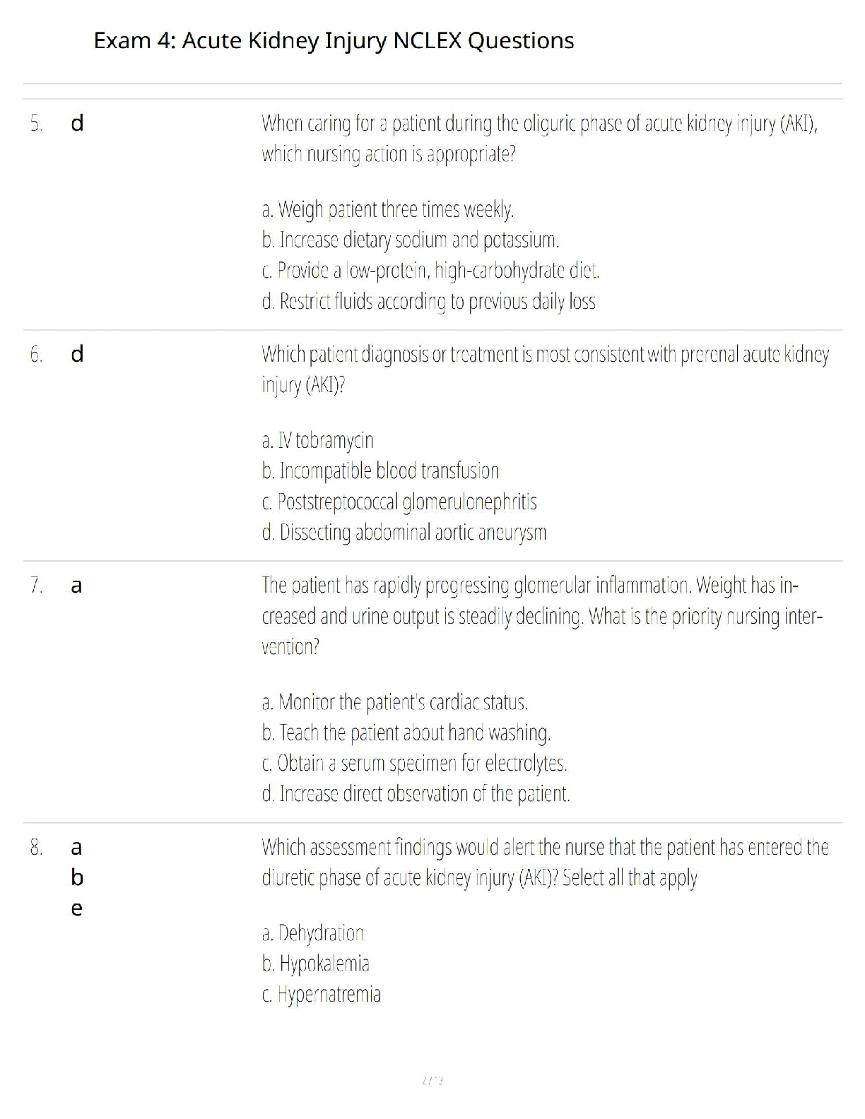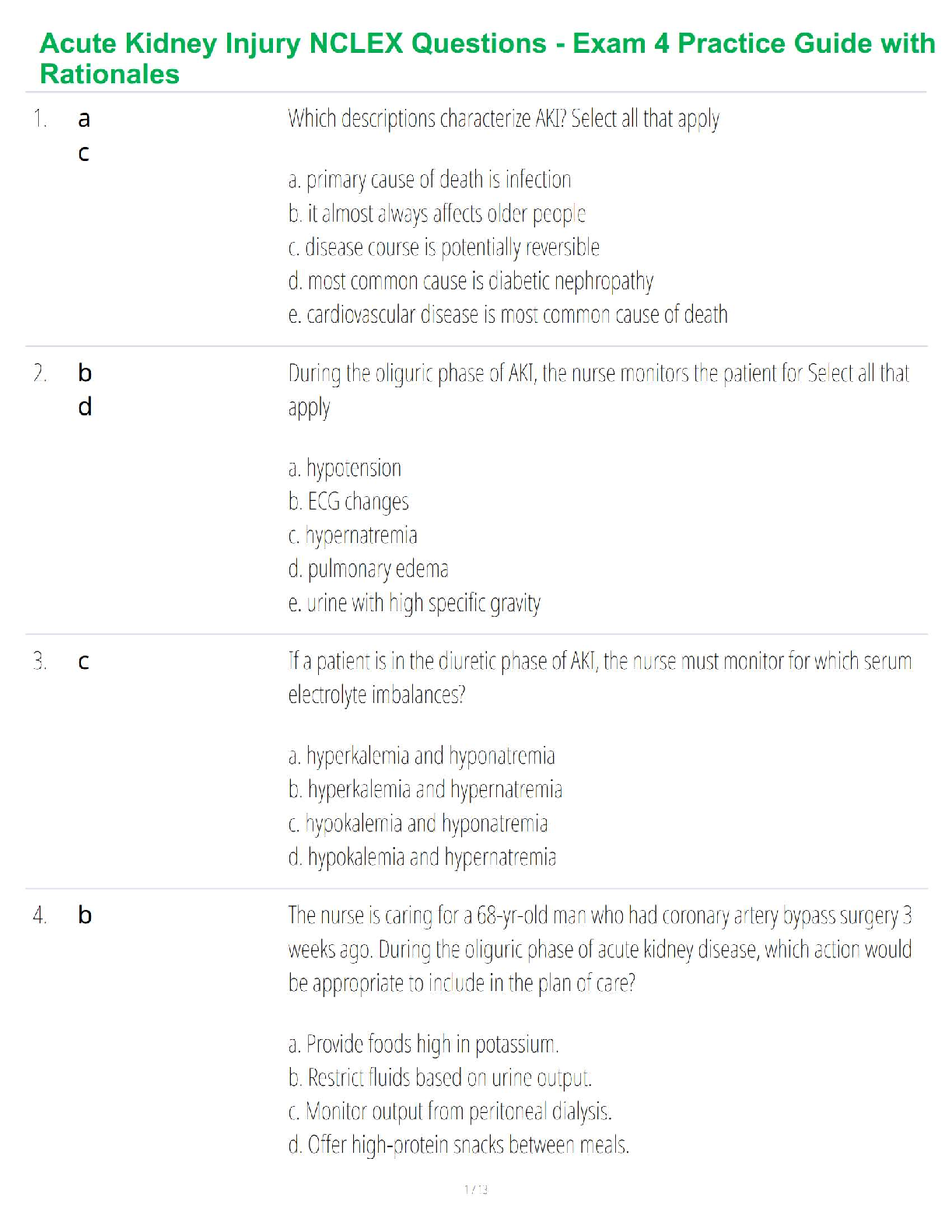 Elevate your NCLEX preparation with this essential test bank focusing on Acute Kidney Injury (AKI). This comprehensive practice resource offers a robust collection of multiple-choice questions alongside in-depth rationales, designed to solidify your understanding of AKI etiology, diagnostics, clinical management, and nursing care. Tailored for the 2025/2026 academic year, it's your ultimate tool to pass the NCLEX on your first try, ensuring you confidently navigate complex renal care scenarios and achieve exam success.
