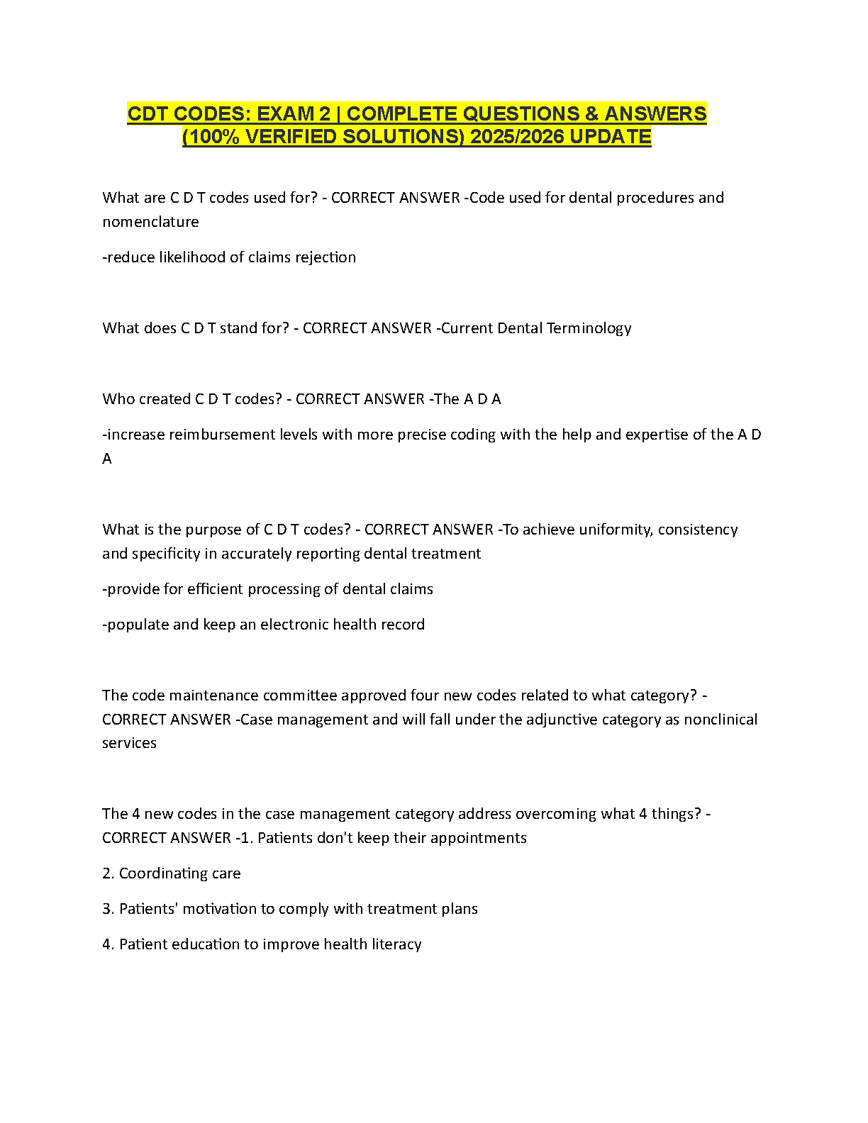 Prepare comprehensively for your dental coding examinations with this up-to-date CDT Codes 2025/2026 Exam 2 Test Bank. Featuring complete questions and 100% verified solutions based on the latest Current Dental Terminology (CDT) guidelines from the American Dental Association (ADA), this resource is designed to ensure you understand crucial concepts. Learn about the application, purpose, and creators of CDT codes, along with recent updates in case management categories. This essential study aid will help you confidently tackle complex dental billing and coding scenarios, securing a passing grade on your first attempt and avoiding costly resits.