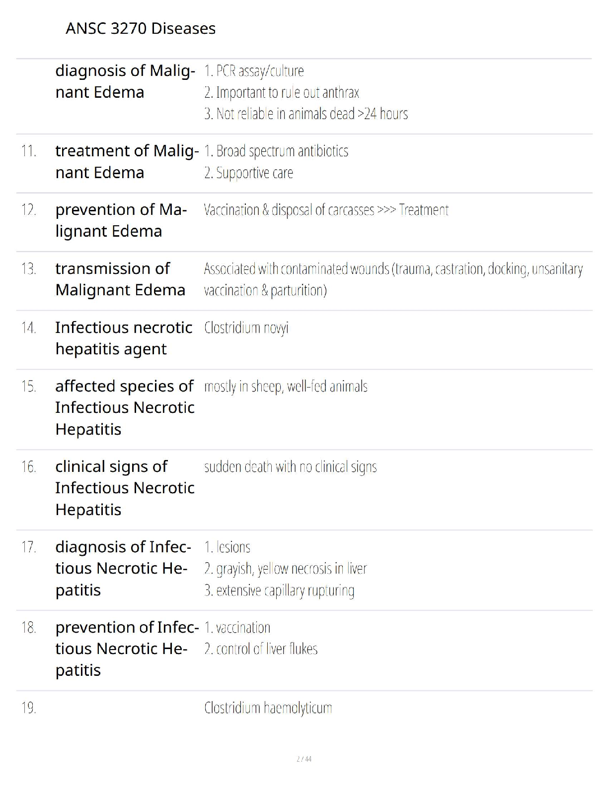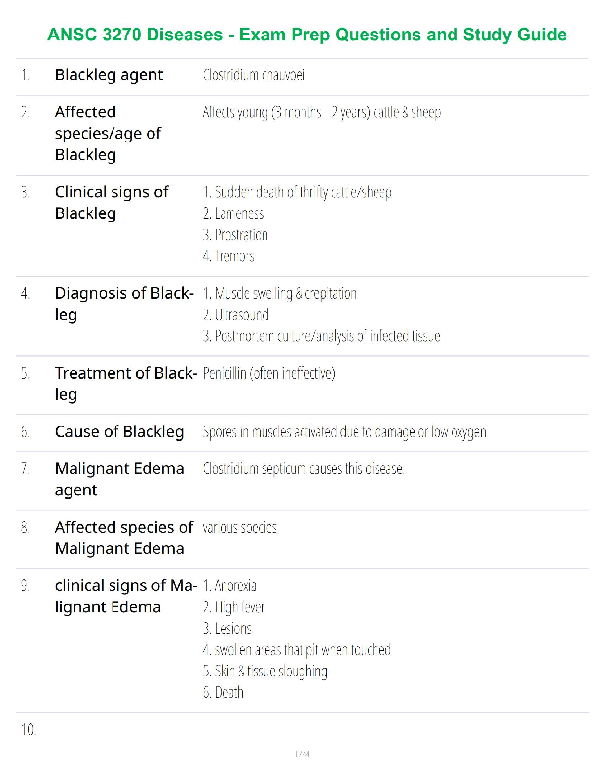 Ace your ANSC 3270 exams with this essential study guide! Featuring detailed questions and answers on key animal diseases like Blackleg and Malignant Edema, this resource is designed to provide students with the knowledge needed to pass on their first attempt. Cover agents, affected species, clinical signs, diagnosis, treatment, and causes to ensure a thorough understanding of the course material. Ideal for the upcoming 2025/2026 academic year.