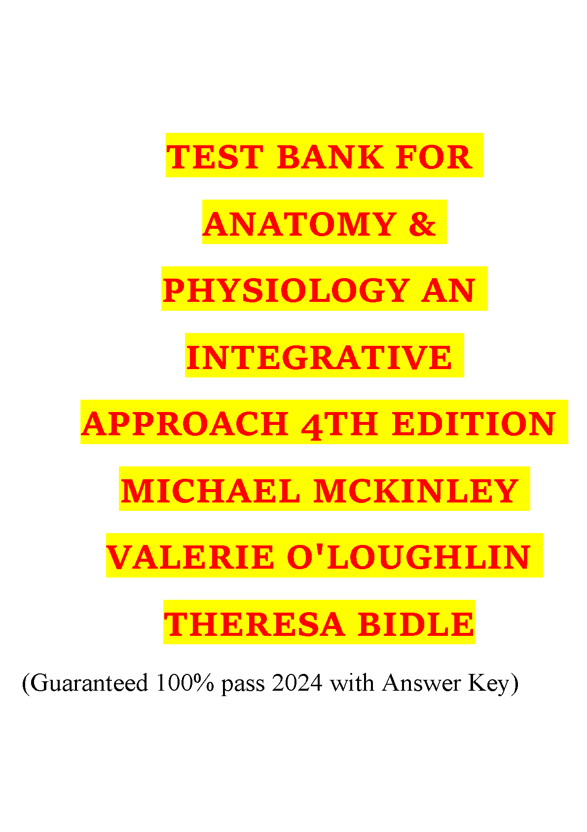 Ace your Anatomy & Physiology exams with this comprehensive Test Bank for the 4th Edition of 'Anatomy & Physiology: An Integrative Approach'. Authored by Michael McKinley, Valerie O'Loughlin, and Theresa Bidle, this resource provides essential questions and answer keys to help students master the material and achieve a first-time pass, avoiding resits for the 2024 academic year. Perfect for exam preparation and deep understanding of key concepts.