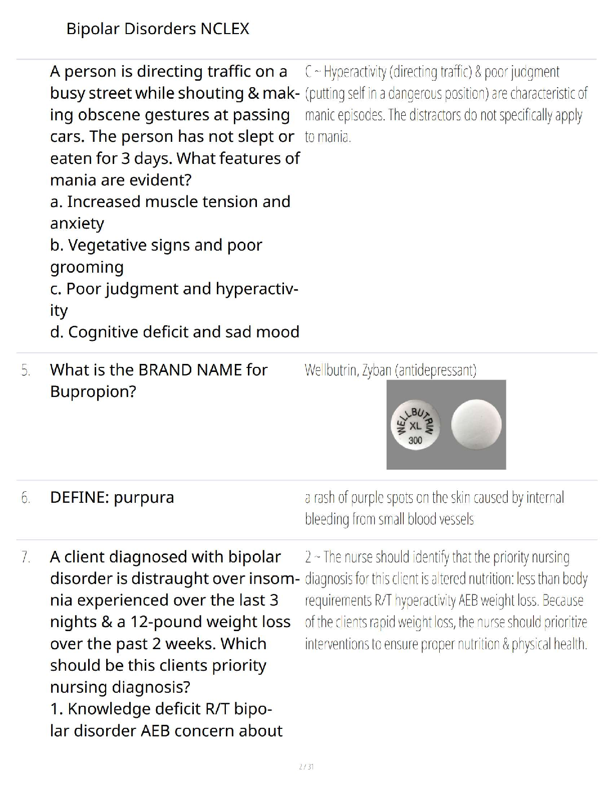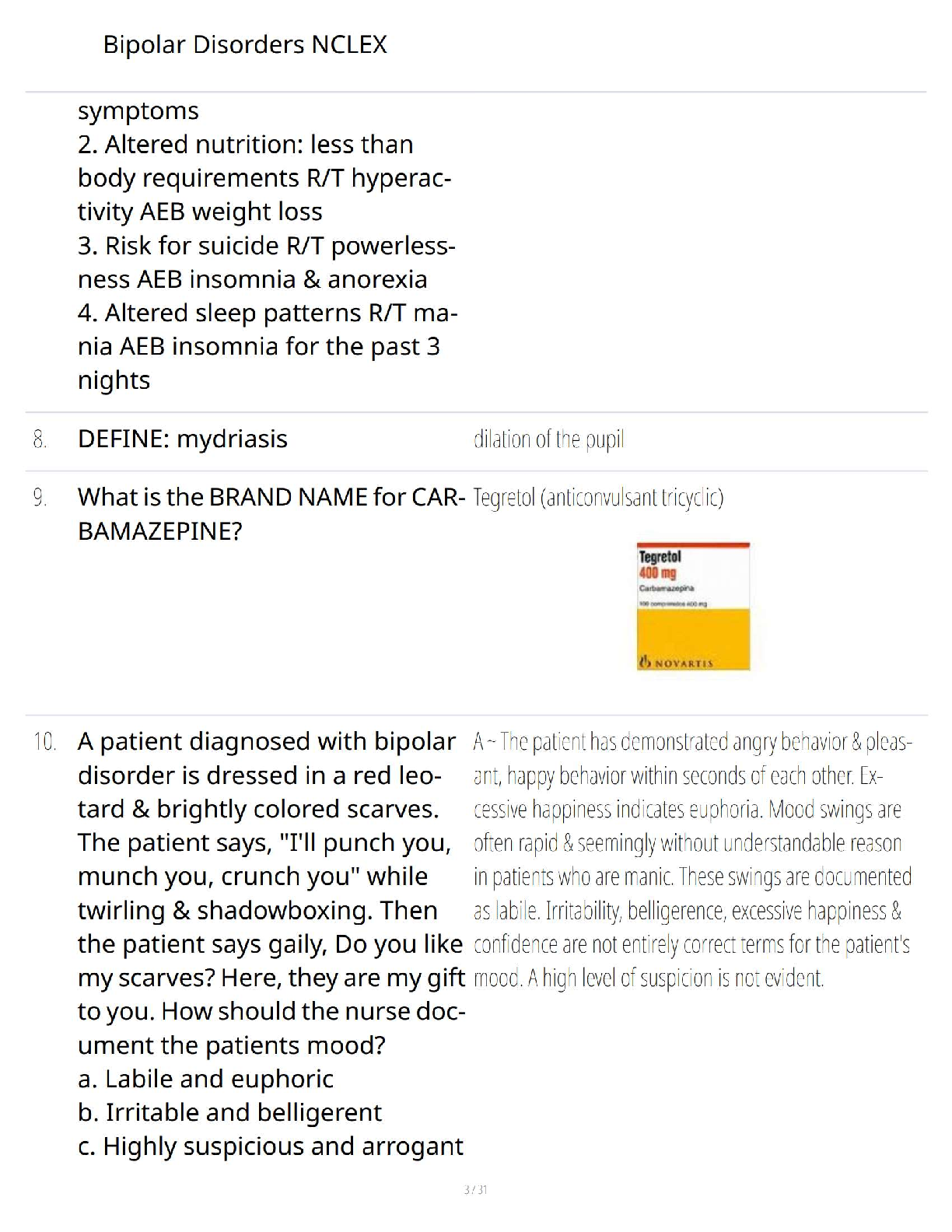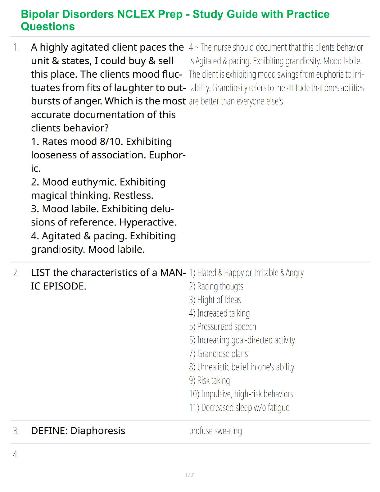 Prepare thoroughly for the NCLEX with this comprehensive Test Bank focusing specifically on Bipolar Disorders in Psychiatric Mental Health Nursing. This invaluable resource features a curated collection of practice questions designed to rigorously test your knowledge on crucial topics such as manic episode characteristics, accurate client documentation, and essential definitions like diaphoresis. Ideal for nursing students aiming for top scores and a deep understanding of mental health concepts, this test bank ensures you are fully equipped for exam readiness and can confidently apply high-yield content to excel in your nursing career.