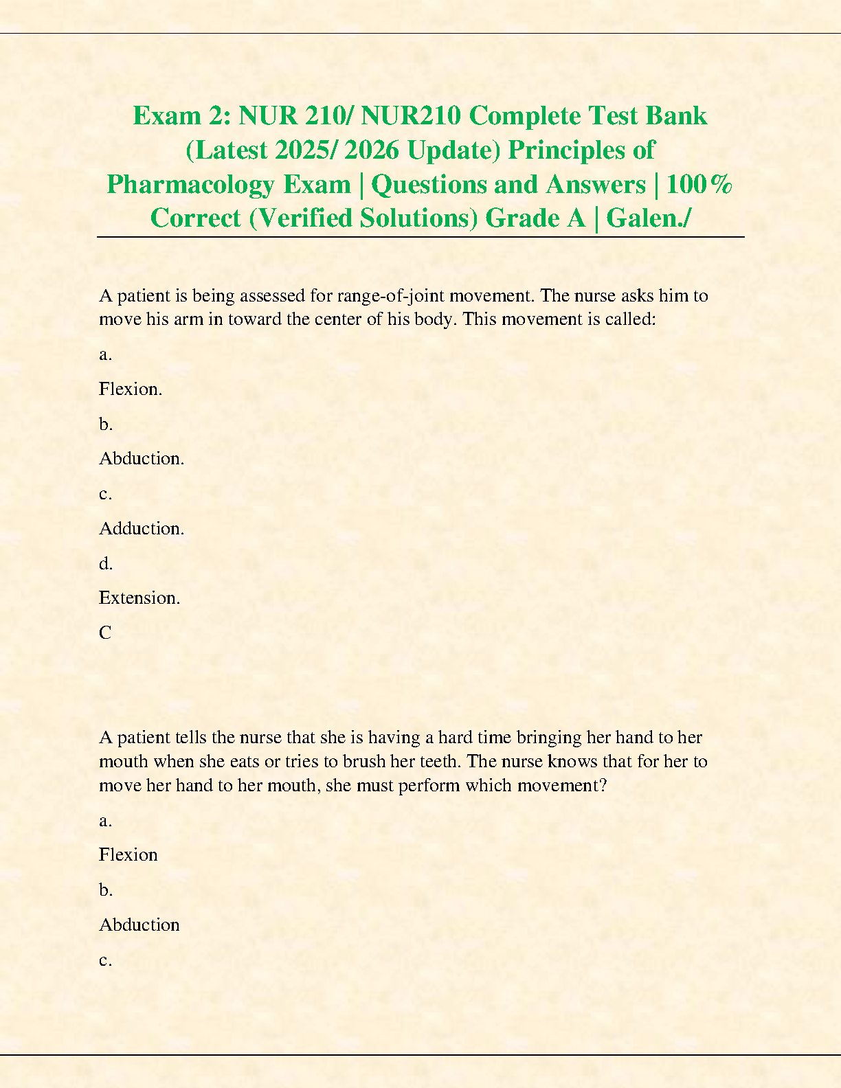 Ace your NUR 210/NUR210 Principles of Pharmacology exam with this comprehensive test bank. Featuring the latest 2025/2026 update, this resource includes exam questions and 100% correct, verified solutions, designed to help students pass on their first attempt and avoid resits. Master key concepts and ensure academic success.