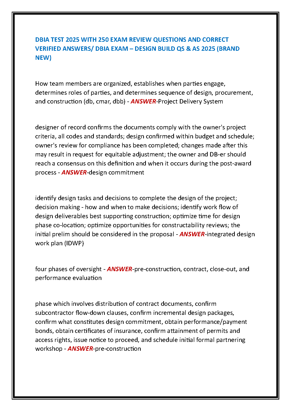 DBIA Test 2025: 250 Exam Questions & Verified Answers for Design Build QS and DBIA Exam Prep - The Ultimate Guide for First-Time Success