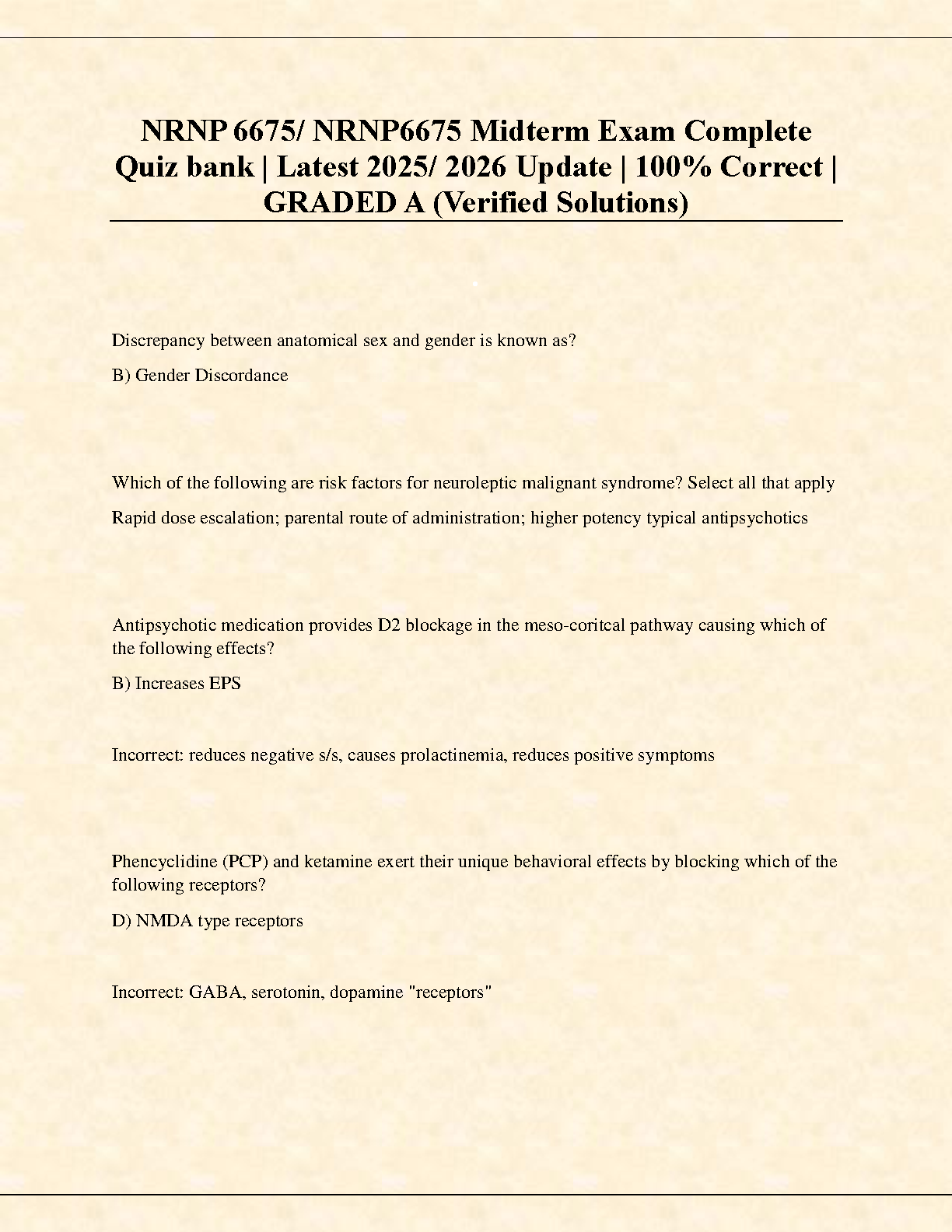 Prepare to ace your NRNP 6675 Midterm Examination for the 2025/2026 academic year with this comprehensive and fully updated quiz bank. This essential resource is meticulously crafted to help Psychiatric Mental Health Nurse Practitioner (PMHNP) students master critical course concepts and achieve a top grade on their first attempt, avoiding costly resits. It features a wide range of practice questions with 100% correct, expert-verified solutions, ensuring thorough understanding and maximum exam readiness.