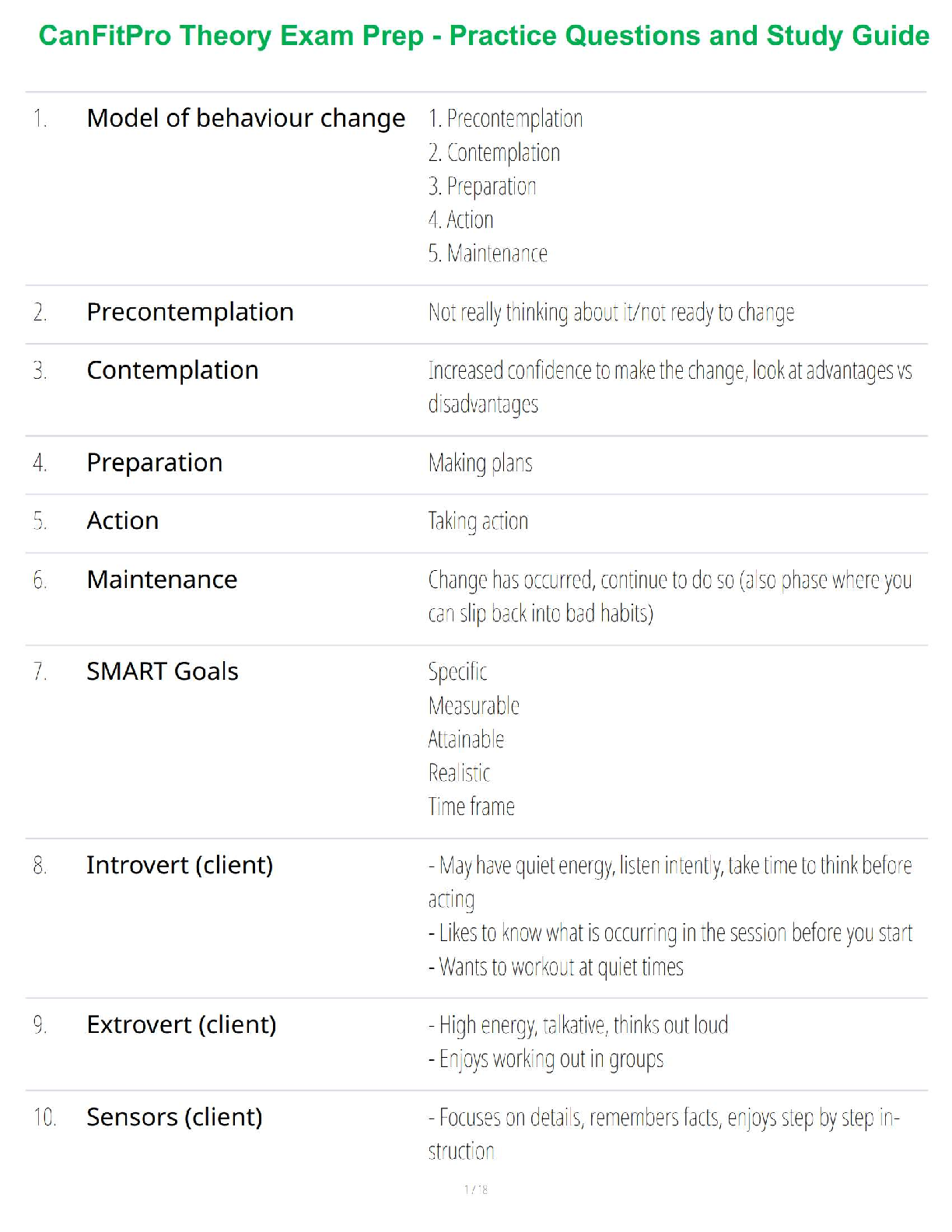 Ace your CanFitPro Theory Exam on the first attempt with this comprehensive 2025/2026 edition prep resource. This guide breaks down key concepts like the 'Model of Behaviour Change' (Precontemplation, Contemplation, Preparation, Action, Maintenance) and client personality types (Introvert, Extrovert, Sensors) in an easy-to-understand format. Includes detailed explanations and study tips designed to help you pass your exam and avoid resits. Perfect for aspiring fitness professionals seeking to solidify their knowledge and gain confidence.