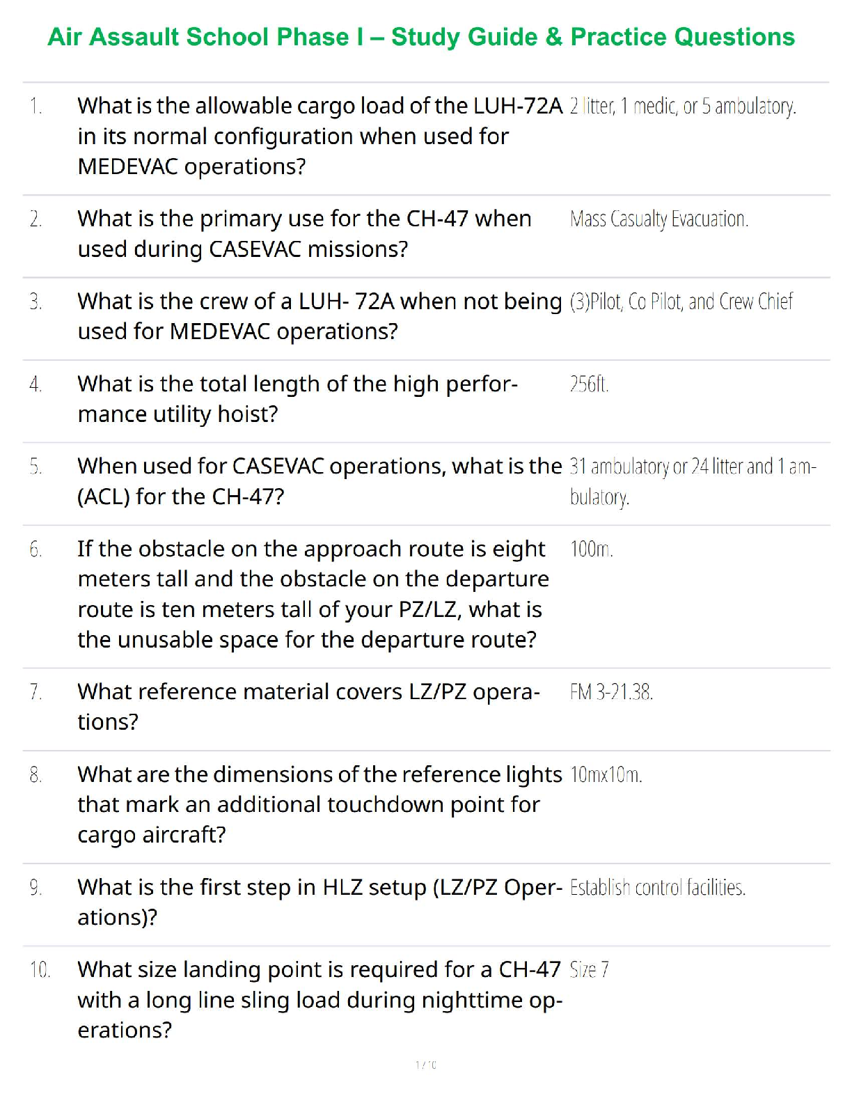 Prepare comprehensively for your Air Assault School Phase I examinations with this indispensable study guide and practice question collection. This resource features a robust test bank covering essential topics such as LUH-72A and CH-47 helicopter operations, MEDEVAC and CASEVAC protocols, precise LZ/PZ (Landing Zone/Pickup Zone) procedures, critical cargo load calculations, and crew responsibilities. Tailored for the 2025/2026 academic year, it provides clear questions and accurate answers designed to solidify your understanding, boost confidence, and ensure you pass your exams on your first attempt, effectively avoiding costly resits. No specific commercial authors or edition numbers are available for this military training material.