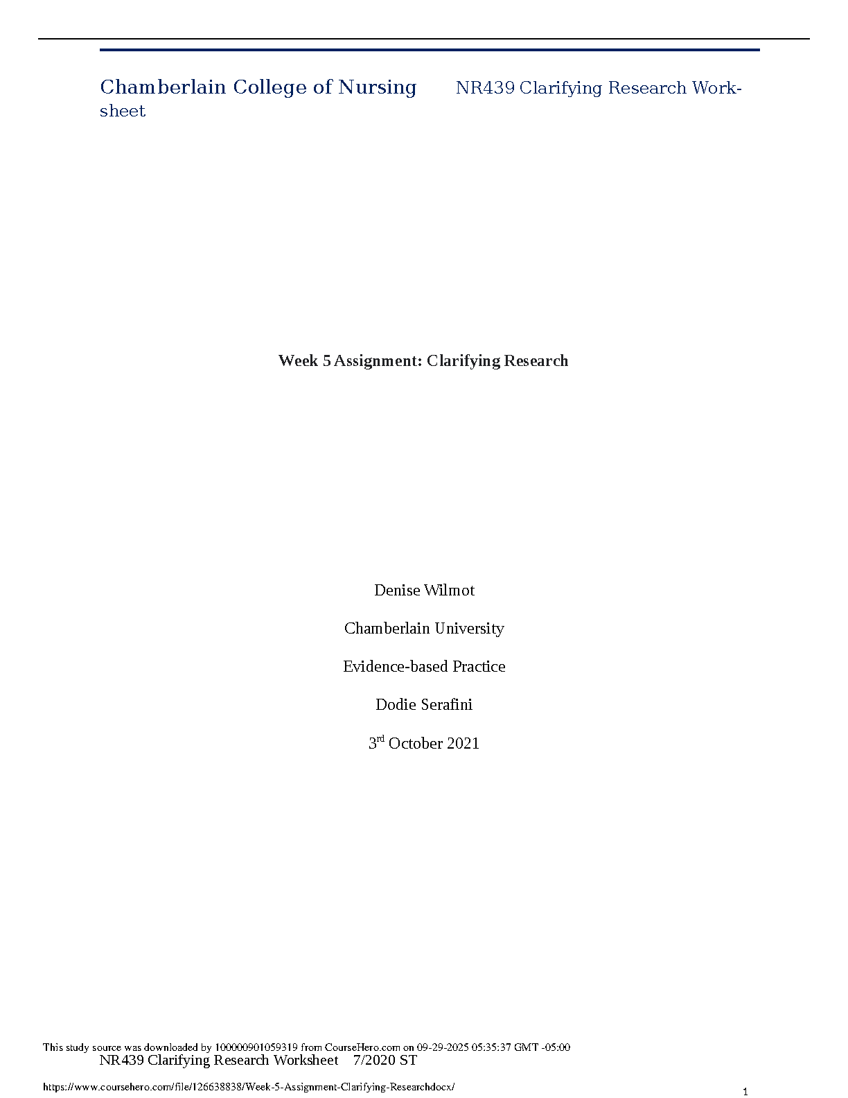 Chamberlain College of Nursing NR439 Clarifying Research Worksheet (Week 5) - Denise Wilmot, Dodie Serafini - 2025/2026 Academic Year
