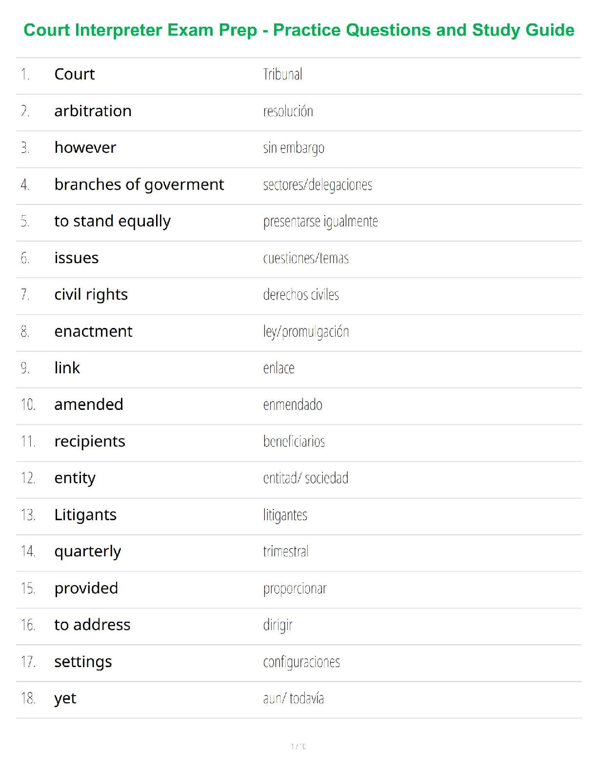 Ace your Court Interpreter exam on the first attempt with this comprehensive practice questions and study guide. This resource is designed for the 2025/2026 academic year, focusing on key legal terminology and providing targeted practice to ensure you avoid resits and achieve success. Learn essential vocabulary and practice interpretation skills for the upcoming academic year.