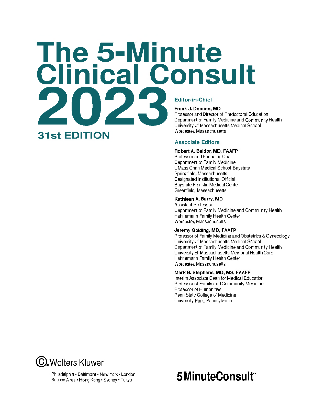 The 5-Minute Clinical Consult 2023, 31st Edition by Frank J. Domino, Robert A. Baldor, Kathleen A. Barry, Jeremy Golding, and Mark B. Stephens