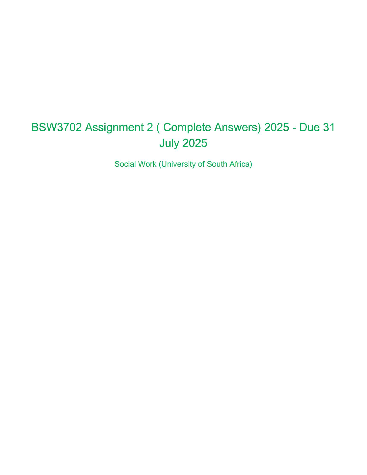 BSW3702 Assignment 2 Complete Answers (2025 Edition) - Unisa Social Work Study Guide to Pass First Attempt