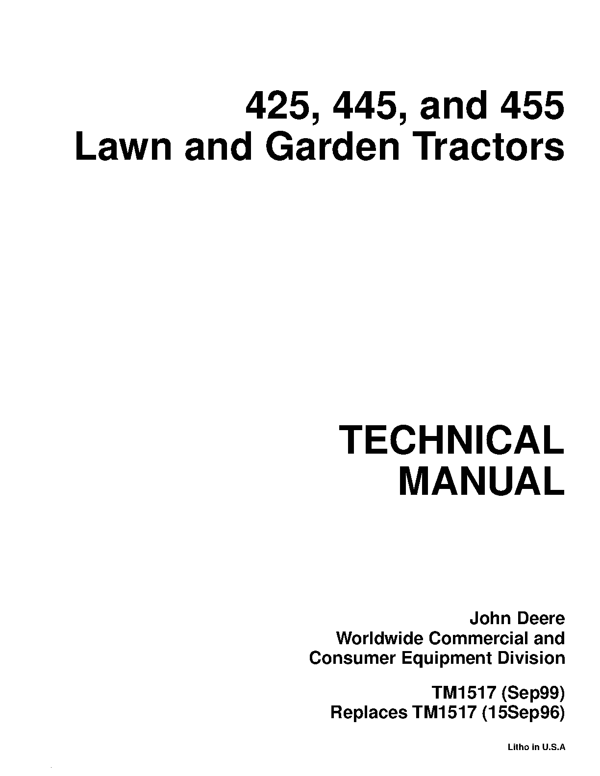 John Deere 425, 445, and 455 Lawn and Garden Tractors Technical Manual (TM1517, Sep99) - Comprehensive Repair Guide