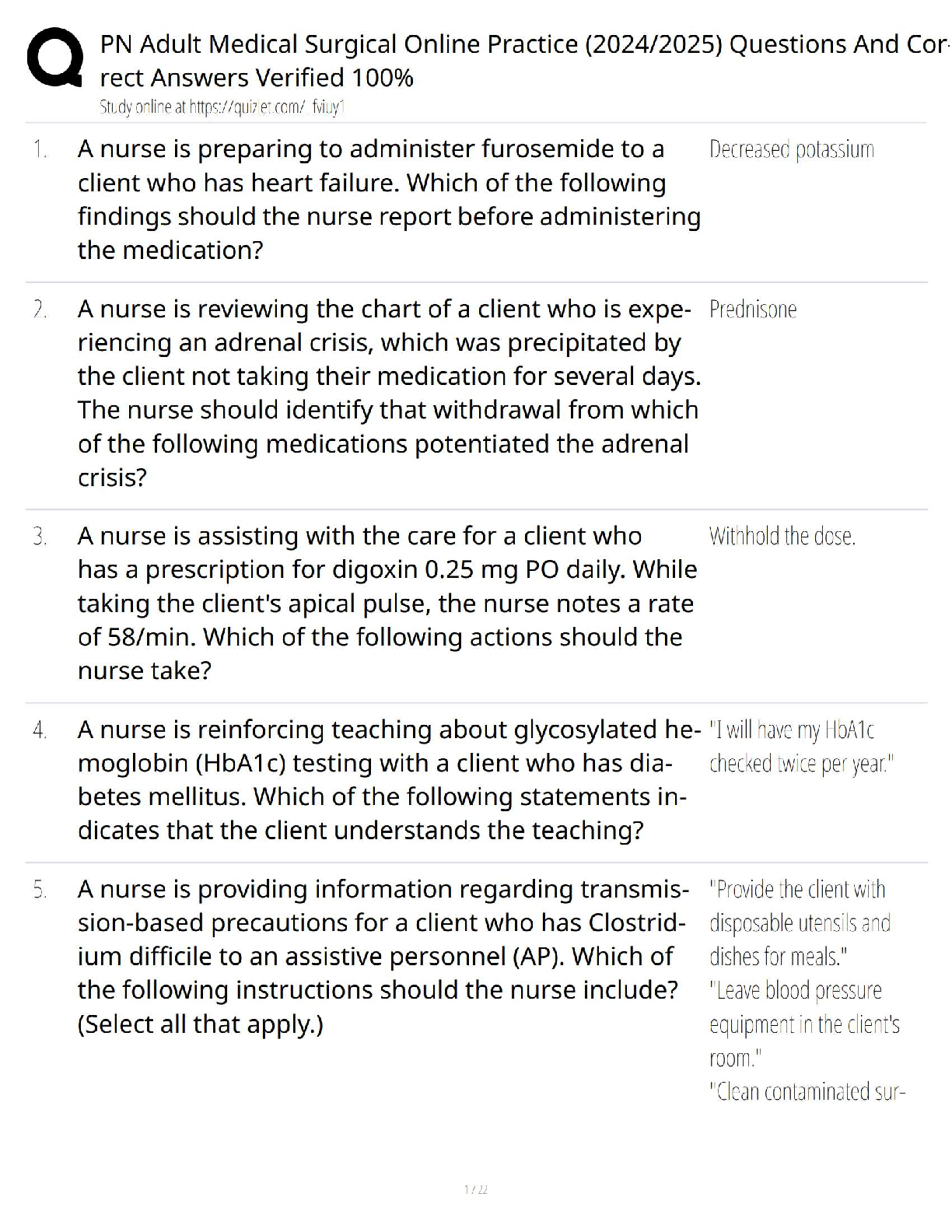 Elevate your preparation for the PN Adult Medical Surgical exam with this extensive practice resource for the 2024/2025 academic year. This comprehensive test bank features a wide array of meticulously curated questions, all accompanied by 100% verified correct answers. Designed specifically for practical nursing students, this material is ideal for strengthening your understanding of critical adult medical-surgical concepts, boosting your confidence, and ensuring you pass your exams on the very first attempt, thus avoiding costly and stressful resits. Master essential nursing knowledge with reliable, up-to-date practice questions.