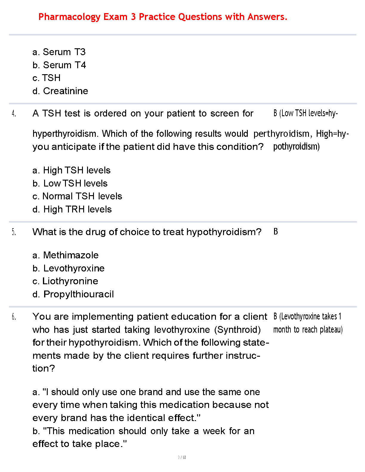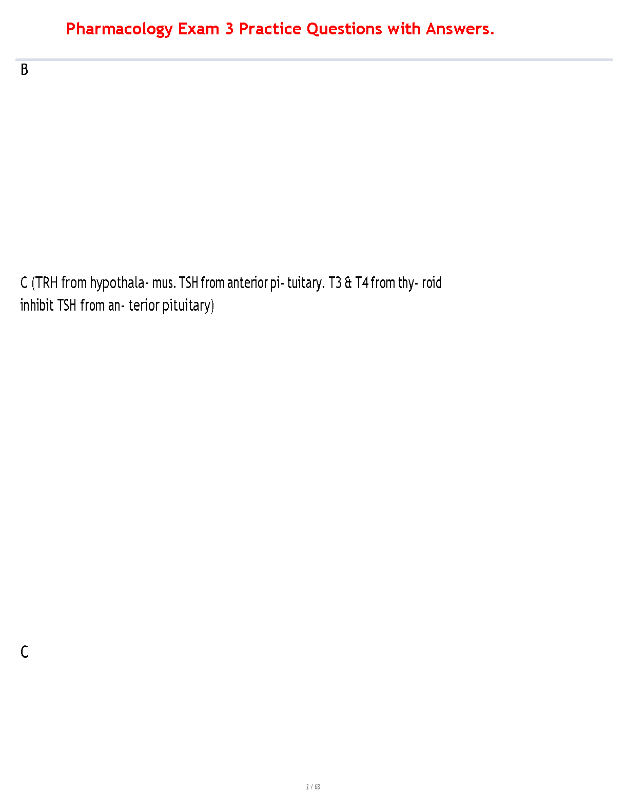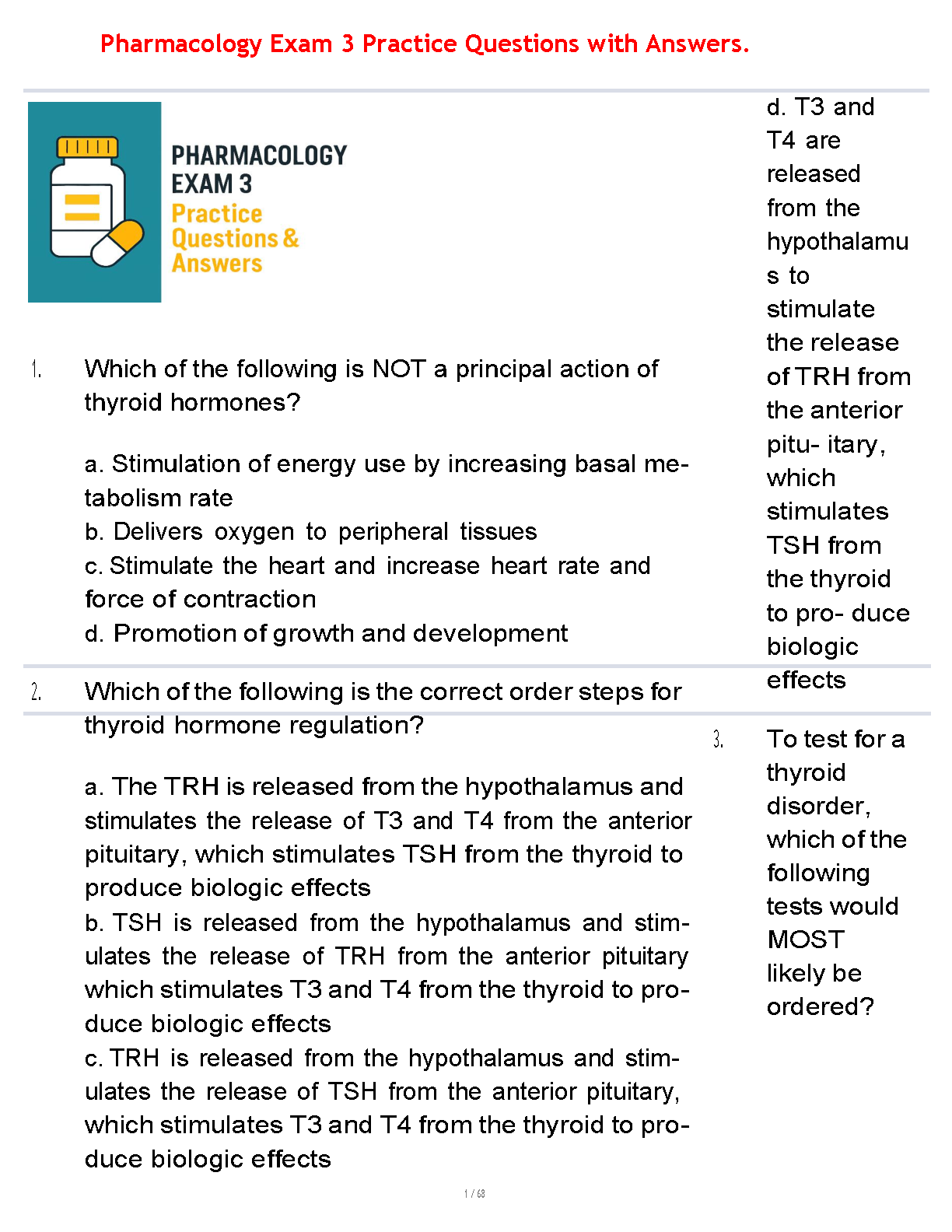 Master your upcoming Pharmacology Exam 3 with this essential, up-to-date Test Bank for the 2025/2026 academic year. This extensive resource offers 68 pages of meticulously curated practice questions covering critical pharmacology topics, including detailed sections on thyroid hormone regulation and other vital concepts. Each question comes with a clear, solved answer, designed to deepen your understanding and boost your confidence. Prepare efficiently, identify knowledge gaps, and ensure you pass your pharmacology exams on the very first attempt, saving time and avoiding costly resits. Perfect for students aiming for top grades and comprehensive mastery of course material.