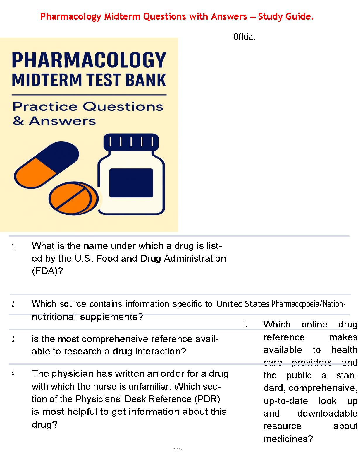 Unlock guaranteed success in your 2025/2026 Pharmacology Midterm exams with this comprehensive Test Bank. Packed with expertly curated practice questions and detailed answers, this essential study guide is meticulously designed to help students master critical pharmacological concepts, boost their understanding, and confidently pass their assessments on the very first attempt, effectively eliminating the need for costly and stressful resits. Perfect for deep revision and concept reinforcement.