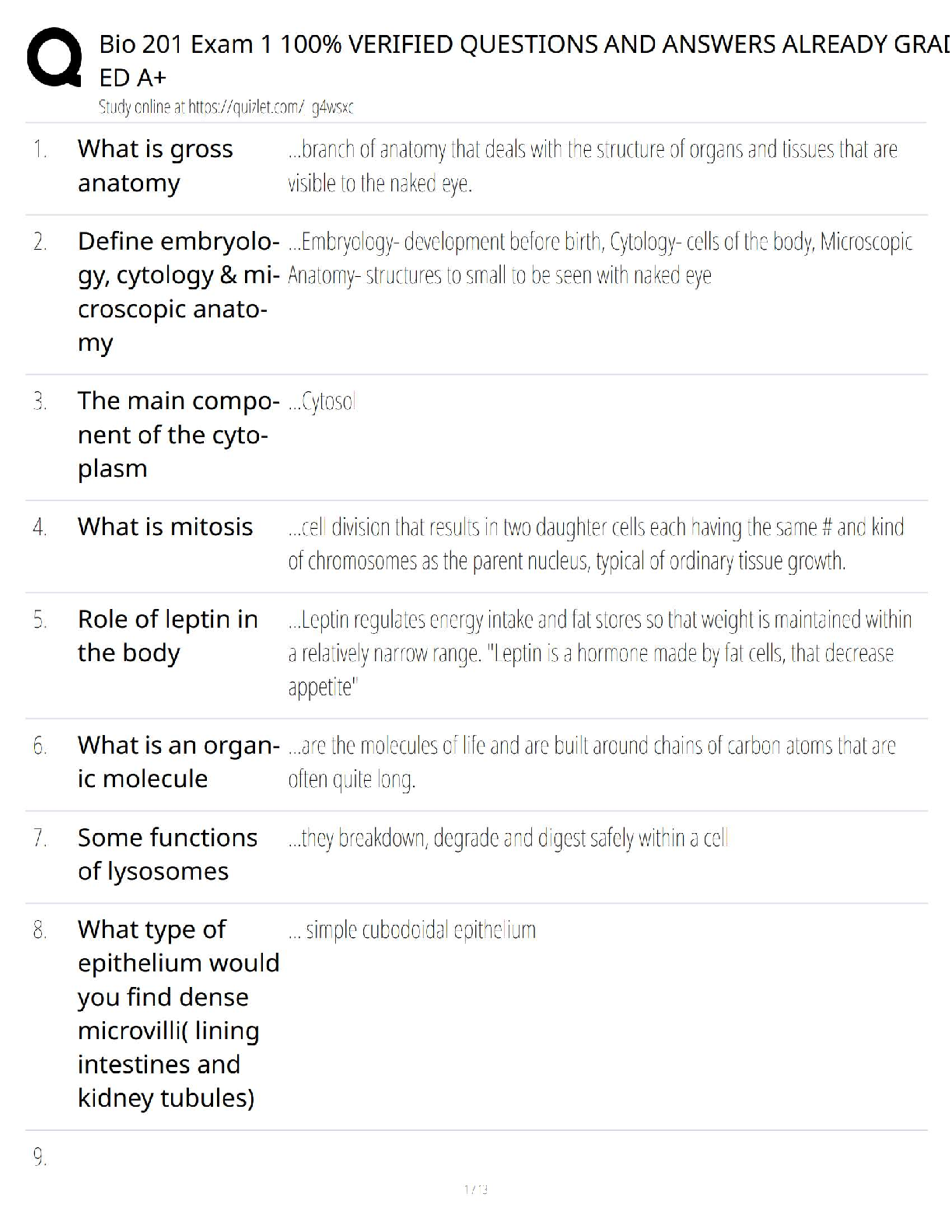 Ace your upcoming Bio 201 Exam 1 with this essential study resource. Featuring 100% verified questions and answers, this guide covers key topics such as gross anatomy, embryology, cytology, mitosis, leptin, organic molecules, lysosomes, and epithelium. Prepare thoroughly for the 2025/2026 academic year and ensure your success on the first attempt, preventing costly resits. This comprehensive material is designed to help students gain a deep understanding of biological concepts and excel in their exams.