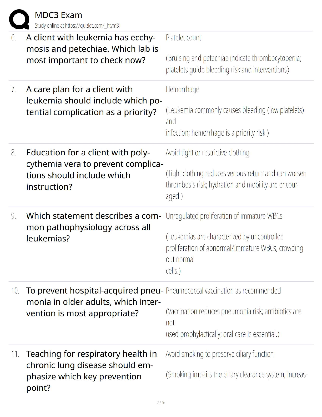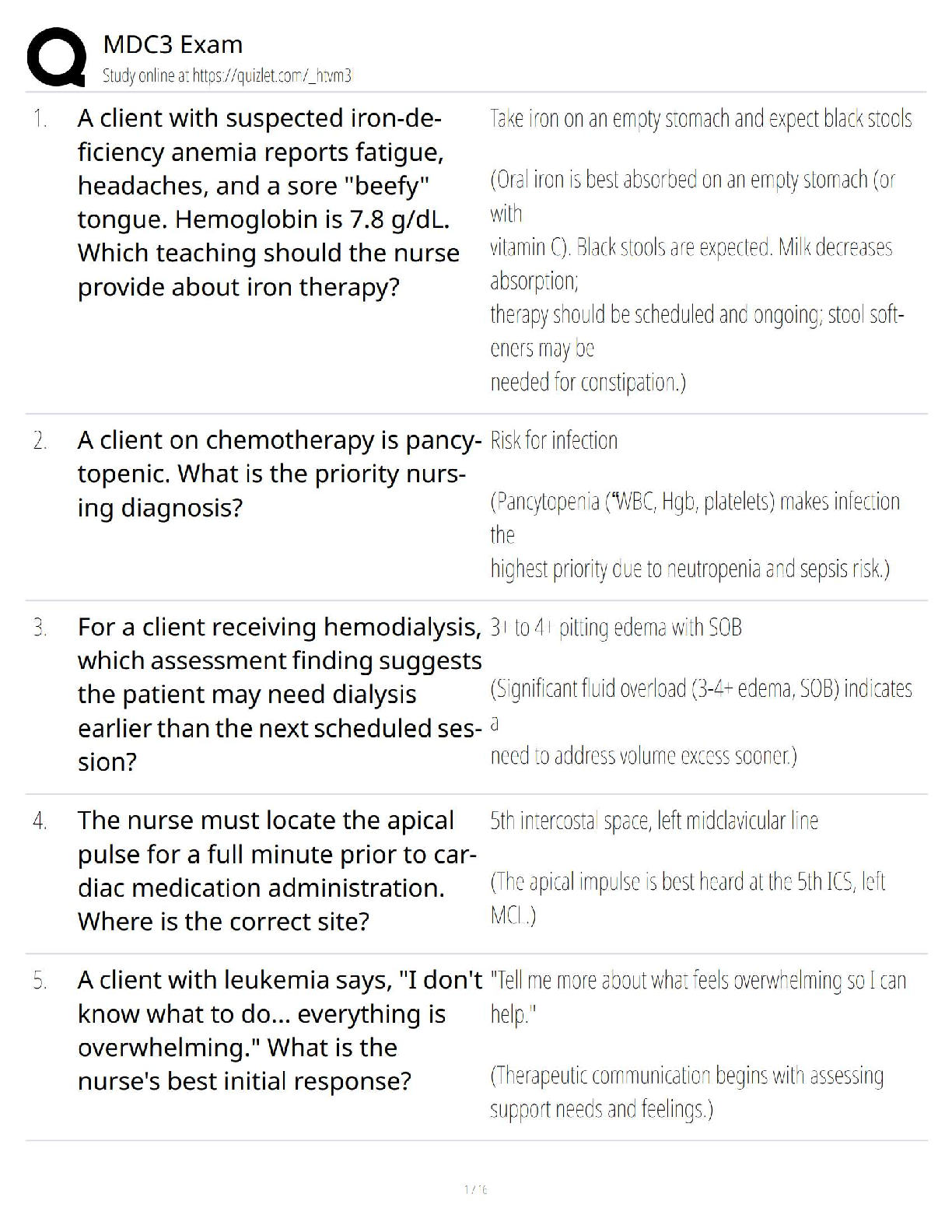 Master the essential concepts for your MDC3 Exam with this robust test bank, designed to sharpen your understanding of Medical-Surgical Nursing. Featuring a wide range of practice questions and detailed answers on critical topics such as iron deficiency, hematologic disorders (pancytopenia), renal care (hemodialysis), and fundamental nursing procedures, this resource is your ultimate tool for thorough preparation and confidence building. Leverage these expertly curated questions to reinforce your knowledge and excel in your nursing assessments.