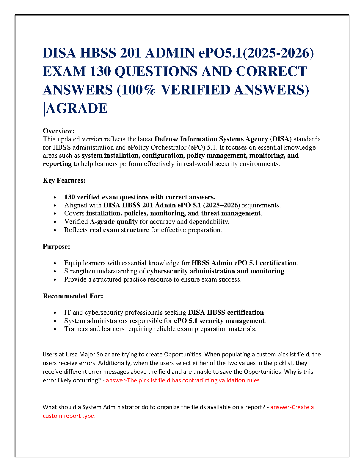 Master the DISA HBSS 201 Admin ePO 5.1 certification with this comprehensive study guide. Featuring 130 verified questions and answers aligned with the 2025-2026 academic year requirements, this resource covers system installation, configuration, policy management, monitoring, and threat management. Designed for IT and cybersecurity professionals, system administrators, and trainers, this guide provides essential knowledge and structured practice to ensure exam success and avoid resits.