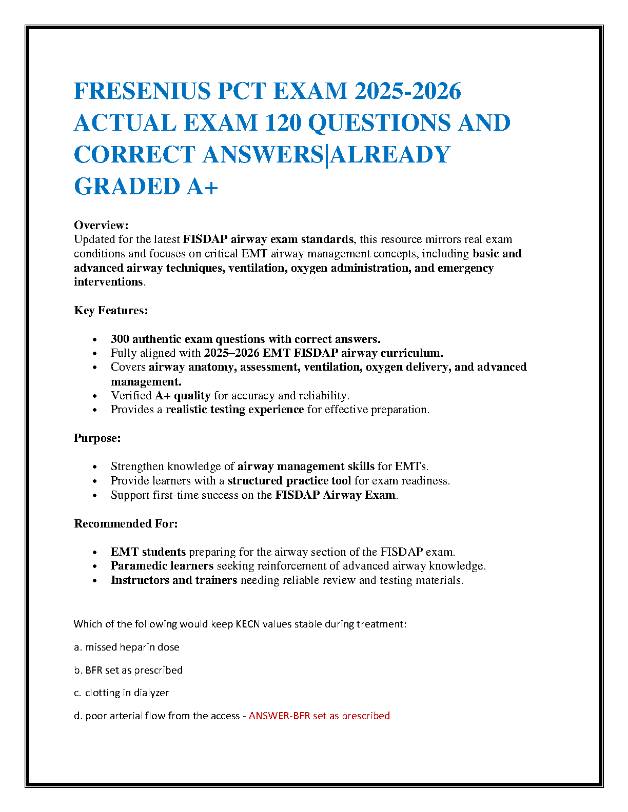 Master EMT airway management and ace your FISDAP Airway Exam on the first attempt with this comprehensive 2025-2026 test bank. Featuring 300 authentic, A+ graded exam questions with detailed answers, this resource is fully aligned with the latest FISDAP EMT airway curriculum. It provides a realistic testing experience, covering essential airway anatomy, assessment, ventilation, oxygen delivery, and advanced techniques. Designed for EMT students, paramedics, and instructors, this practice tool ensures exam readiness and builds confidence for guaranteed success, avoiding resits.