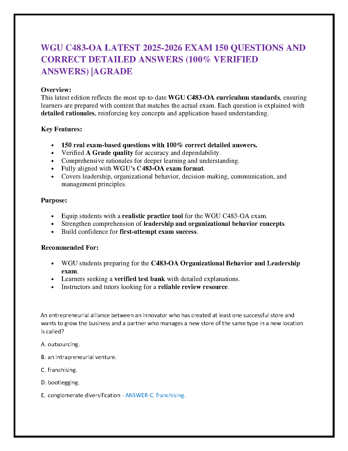 Unlock unparalleled success in your WGU C483-OA Organizational Behavior and Leadership exam with this comprehensive Test Bank, updated for the 2025-2026 academic year. This essential resource offers 150 rigorously verified, exam-based questions, each accompanied by 100% accurate and thoroughly detailed rationales. Designed to precisely align with the latest WGU C483-OA curriculum standards and actual exam format, it ensures you gain a deep understanding of core concepts in leadership, organizational behavior, decision-making, communication, and management. Boost your confidence, achieve an A-grade, and secure first-attempt exam success with this reliable and realistic practice tool, specifically crafted to help you avoid resits.